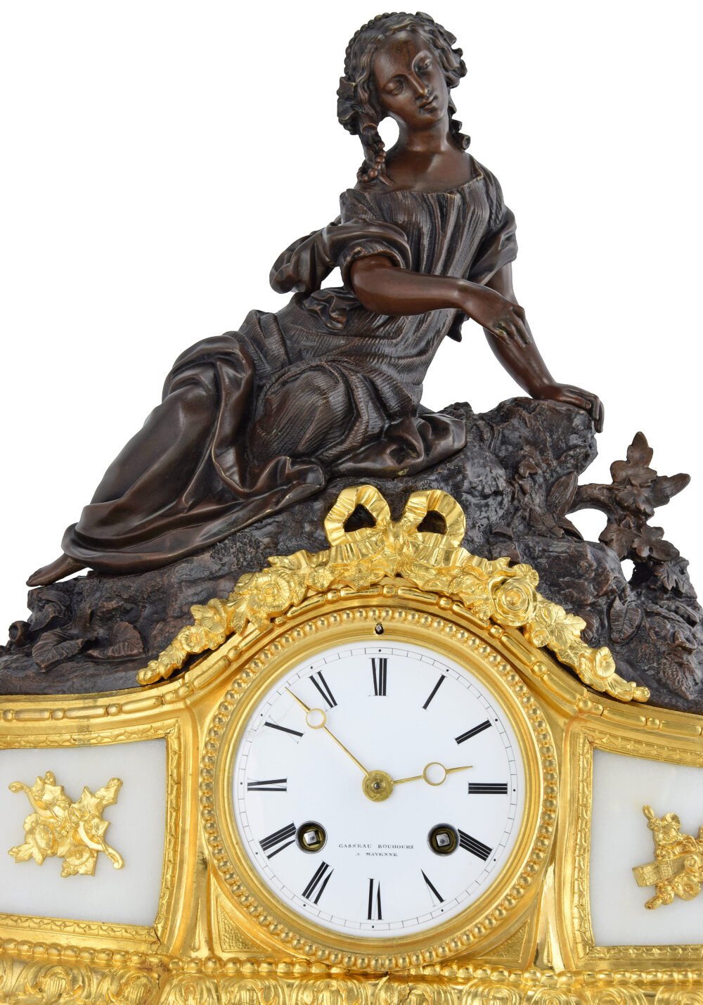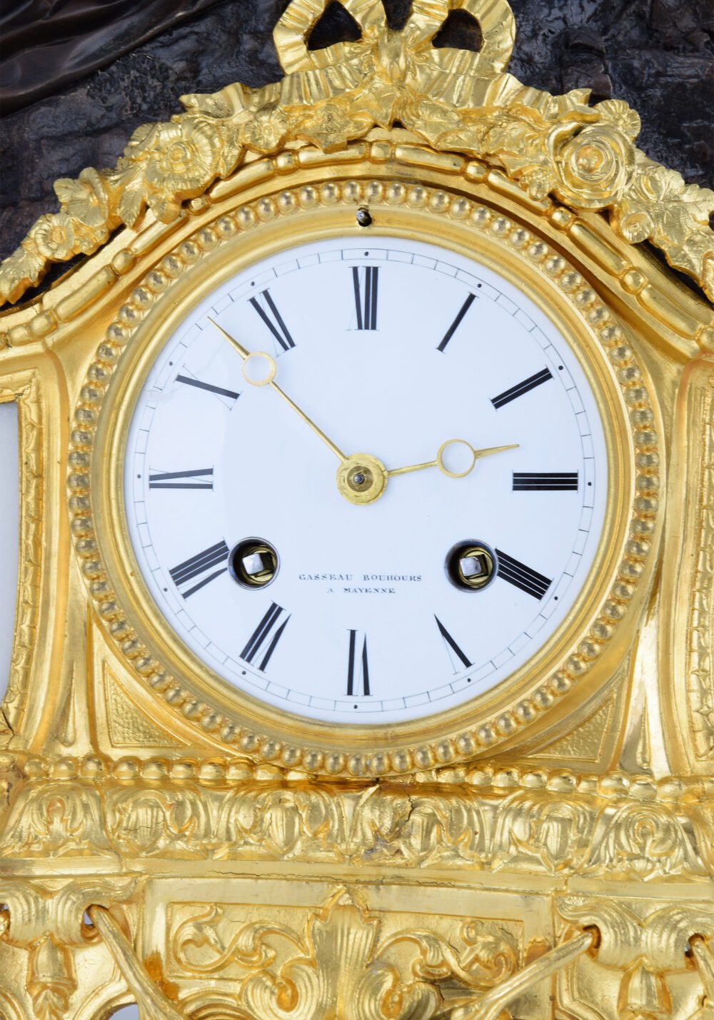 Le cadran en émail blanc circulaire s’inscrit au centre d’un édicule architecturé évoquant une façade classique, rythmé par des encadrements moulurés et des panneaux ornés de motifs en applique. Les bronzes dorés à l’or, abondamment travaillés, déploient un vocabulaire décoratif inspiré du répertoire Louis XV et Louis XVI : rinceaux feuillagés, guirlandes florales, agrafes et enroulements rocaillés animent la surface avec une grande virtuosité.