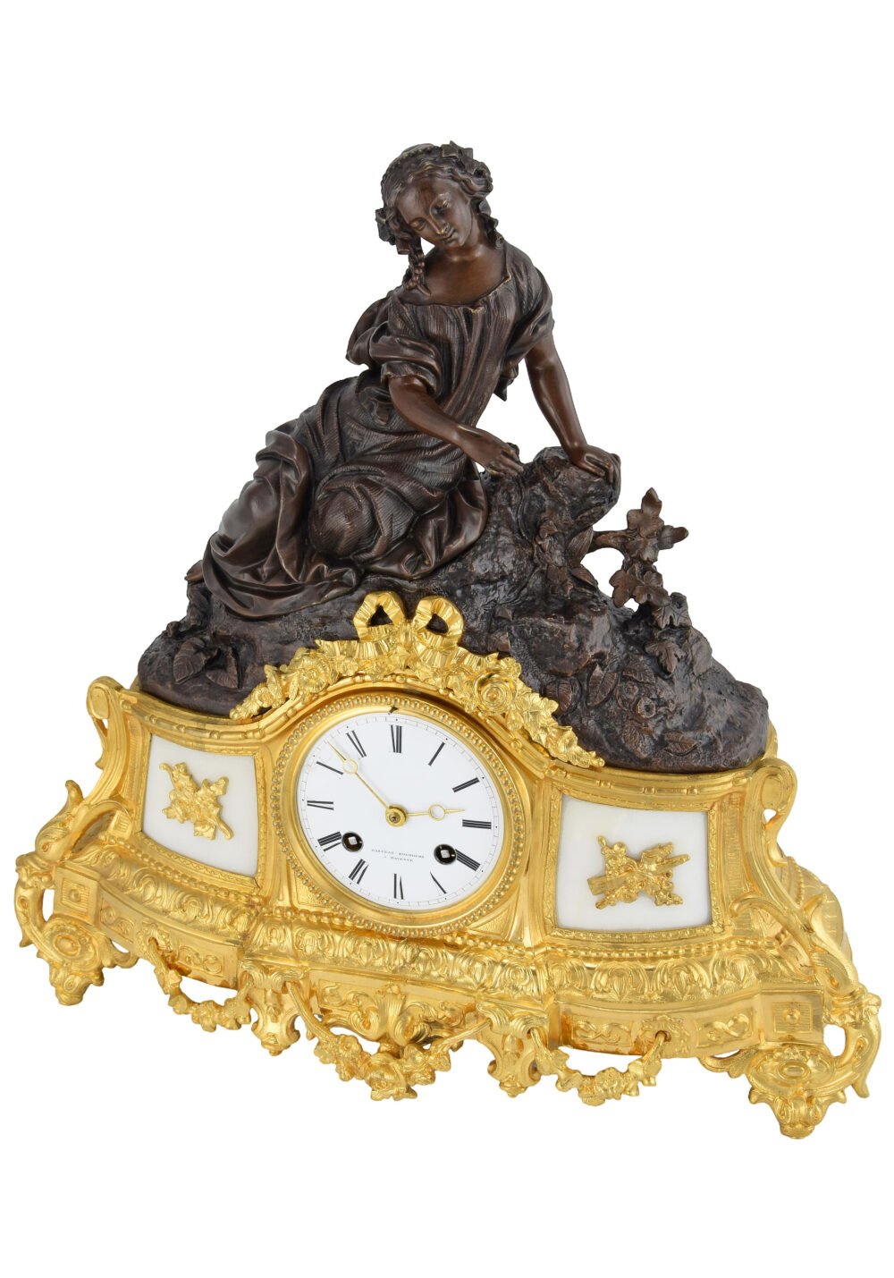 Dominant la pendule, une figure féminine en bronze patiné constitue le véritable point focal de la composition. Allongée avec naturel sur un tertre rocheux traité de manière pittoresque, elle adopte une posture souple et gracieuse, caractérisée par une légère torsion du buste et un appui délicat du bras qui crée une impression de détente contemplative. Le modelé du drapé, finement strié, épouse les formes du corps et accentue la fluidité du mouvement tout en révélant le savoir-faire du sculpteur dans le rendu des textures. L’expression du visage, douce et introspective, se distingue par une inclinaison subtile de la tête et un regard abaissé empreint de sérénité. Les traits délicats, les paupières mi-closes et le léger sourire confèrent au personnage une dimension poétique et rêveuse, typique des figures allégoriques du XIXᵉ siècle. La coiffure, composée de mèches ondulées et savamment ordonnées, participe à cette impression de grâce intemporelle.