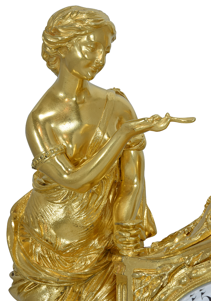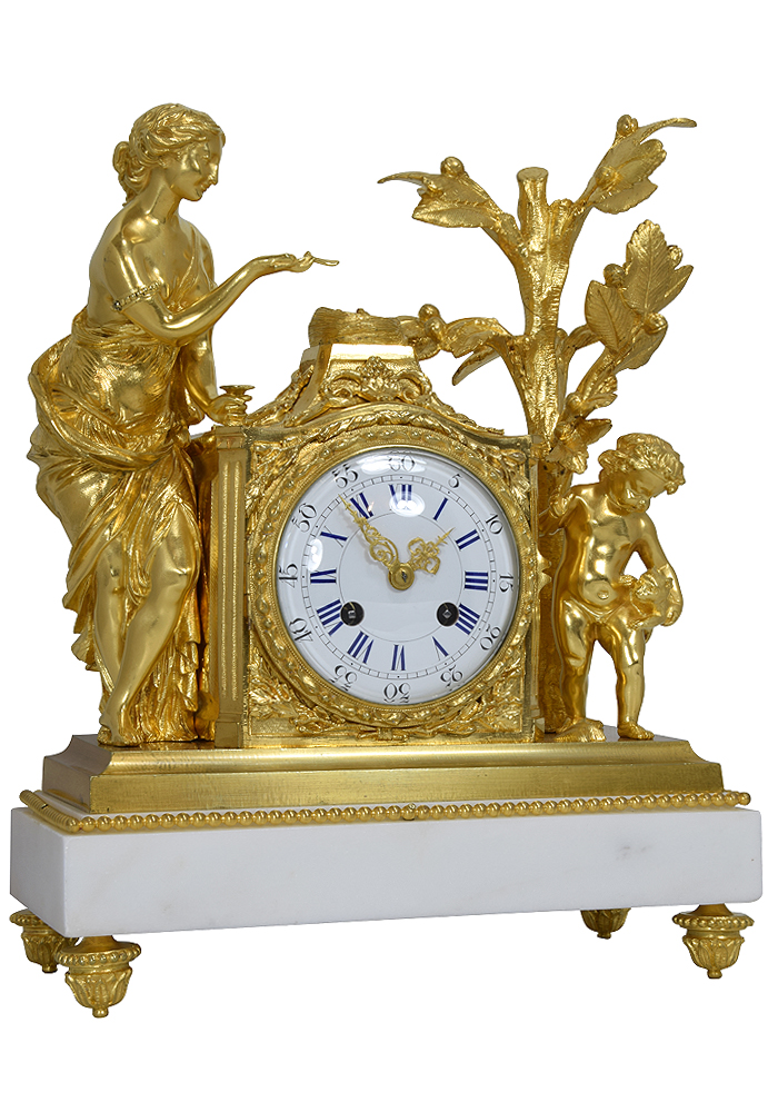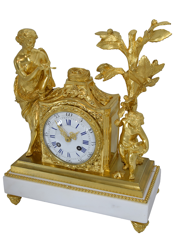 Pendule d’époque Napoléon III de style Louis XVI en bronze doré et marbre blanc de carrare. A décor d’une vestale finement ciselé tenant un tazza et une cuillère pour nourrir des oisillons dans un nid. Près d’un arbre au large feuillage, un chérubin porte un chien l’empêchant d’approcher à l’oisillon à ses pieds.