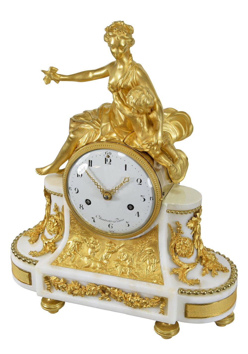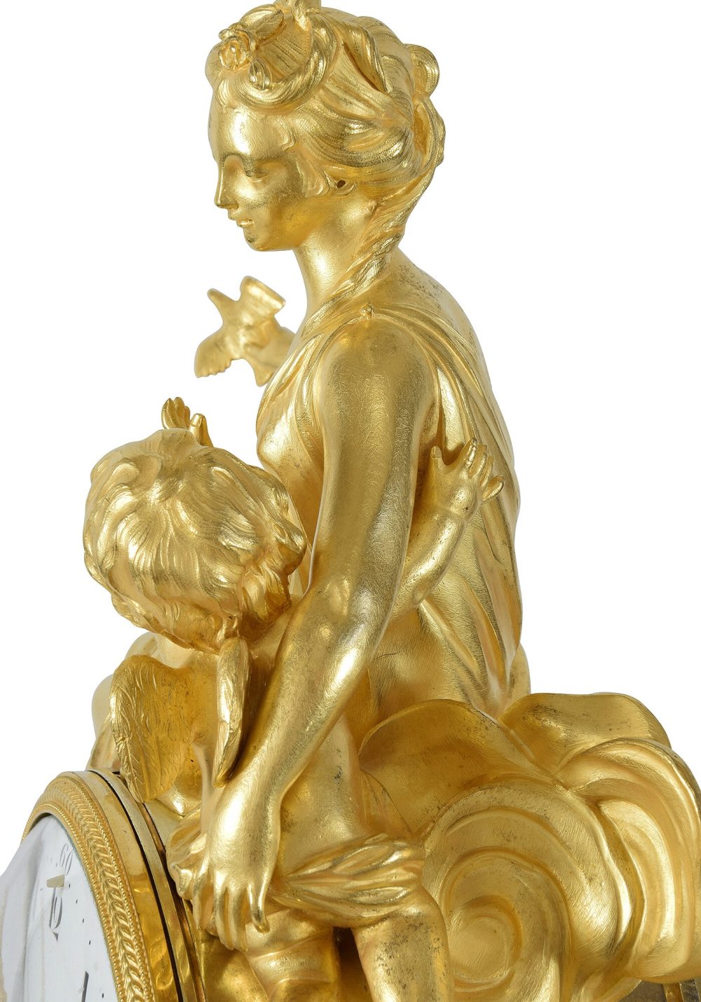 Magnifique pendule d’époque Louis XVI signé sur le cadran « Chantrot Paris ». Horloger répertorié dans le Tardy, dictionnaire des horlogers français. En bronze doré au mercure finement exécuté sur le thème d’une allégorie de la protection et de la paix à figure d’une très belle Vénus éloignant une colombe d’un angelot chasseur. ils reposent tous deux sur une nuée de nuage.