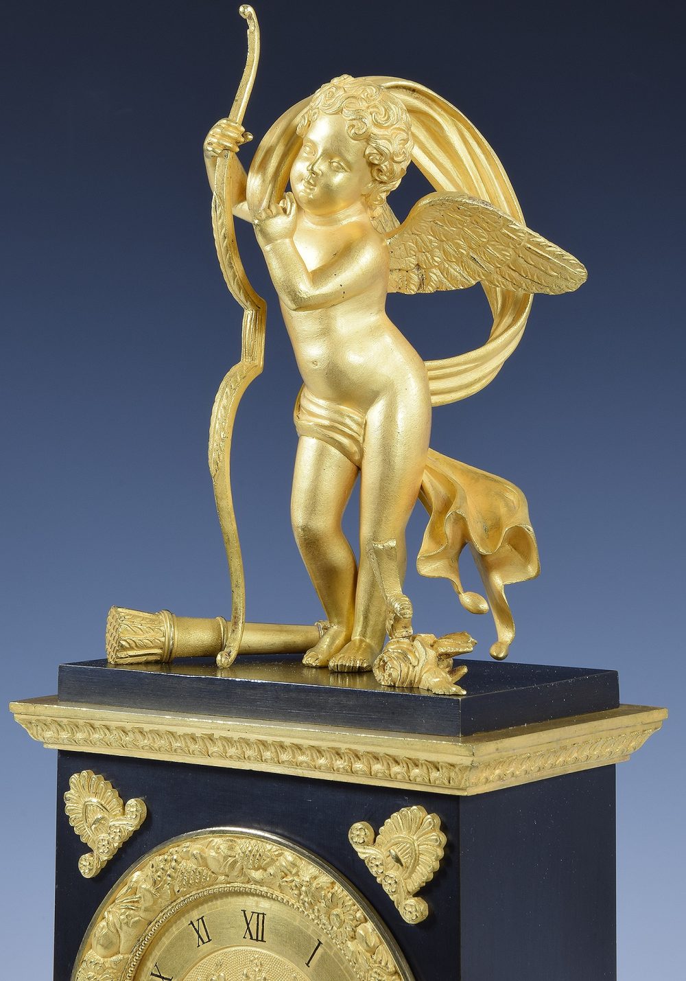 Époque début XIXème, Restauration vers 1820. Architecture en bronze patiné et d’une ornementation très finement ciselé en bronze doré au mercure à l’or. Sculpture à figure de Cupidon à la gestuelle demandant le silence, il tient son arc, un carquois repose à ses pieds et une abeille butine une fleur. La façade accueille le cadran ciselé au centre de fleurs et souligné d’un épais contour de fruits accompagné par quatre encoignures.
