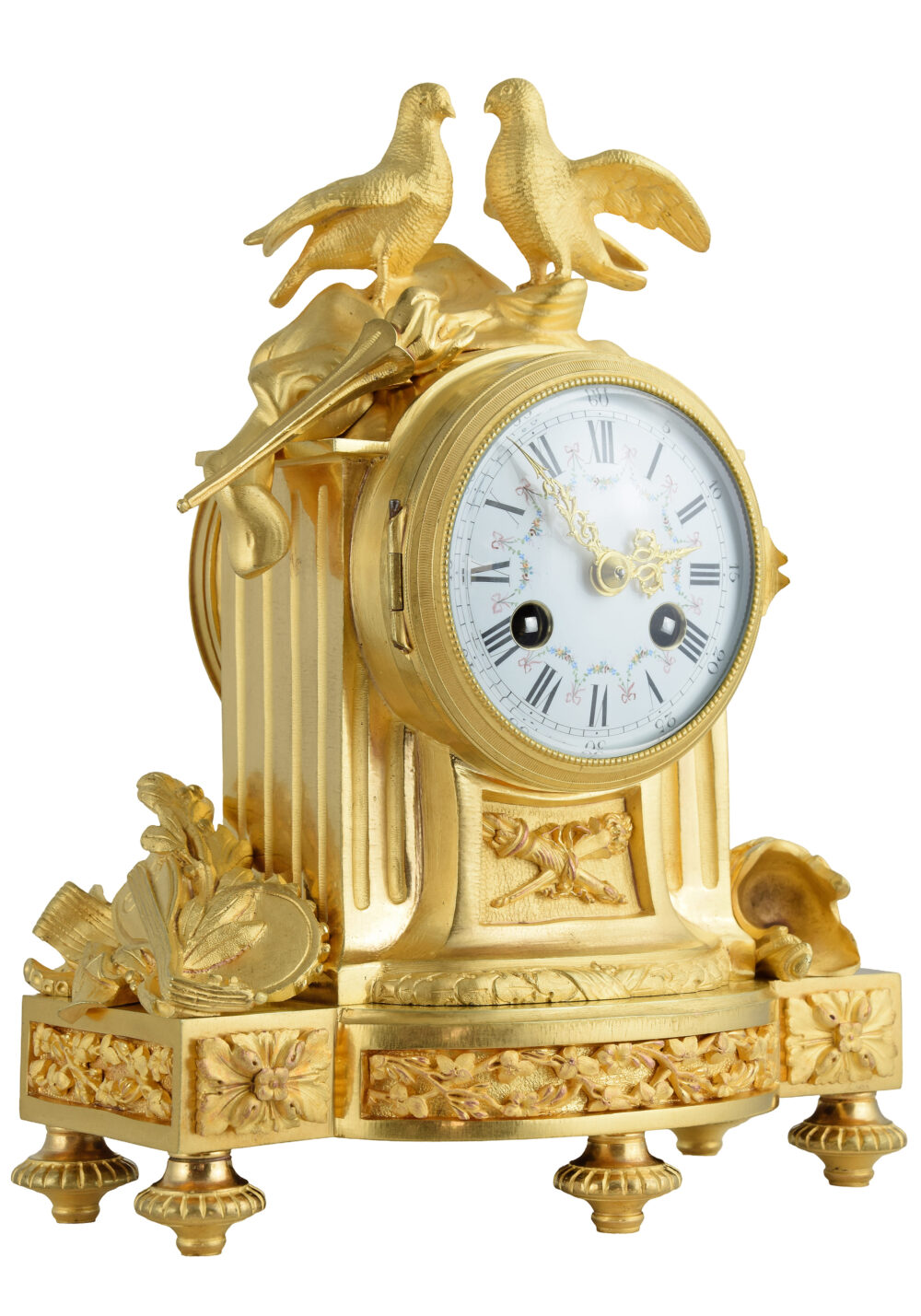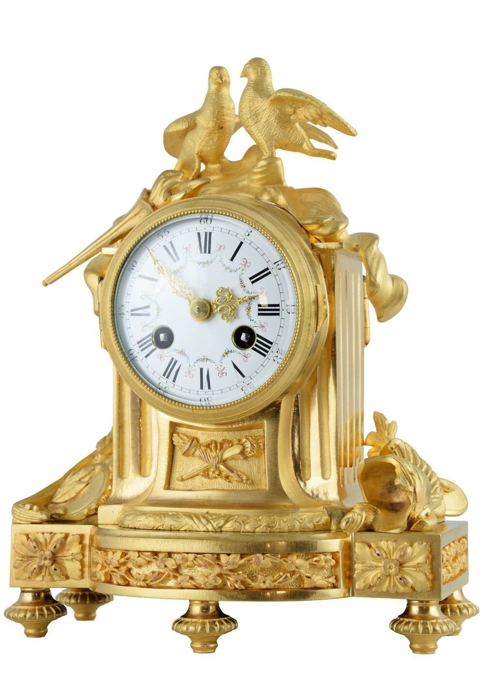L’architecture, en bronze finement ciselé et doré à l’or, présente au centre une colonne à cannelures supportant un cadran bombé en émail blanc, délicatement décoré d’une guirlande polychrome. Il est accompagné de fines aiguilles dorées et protégé par un verre bombé.
