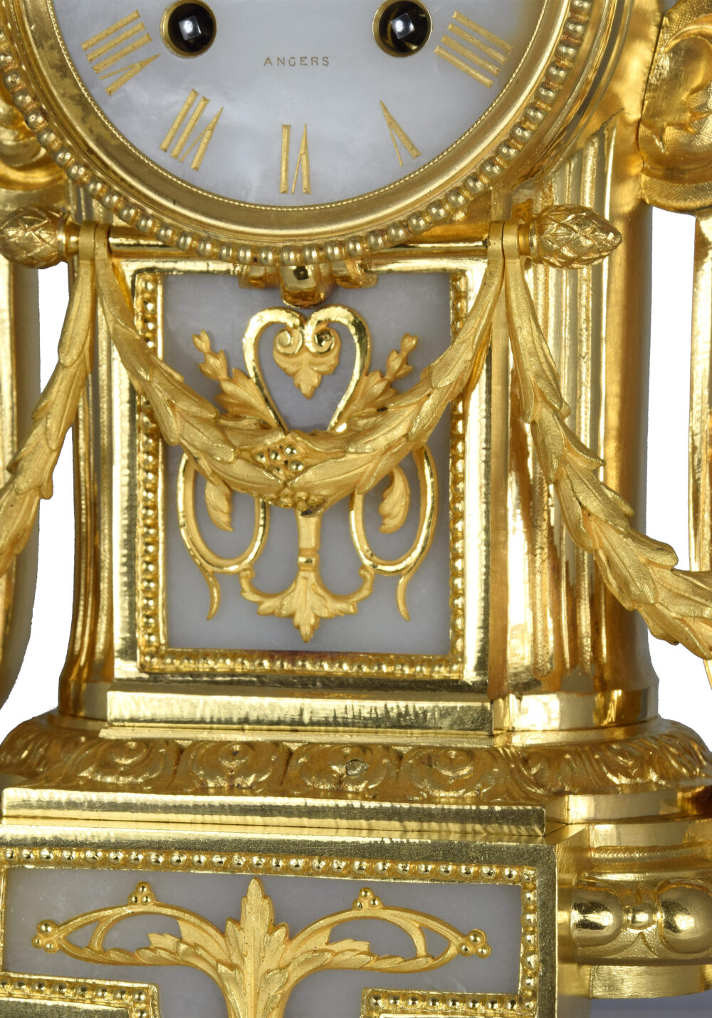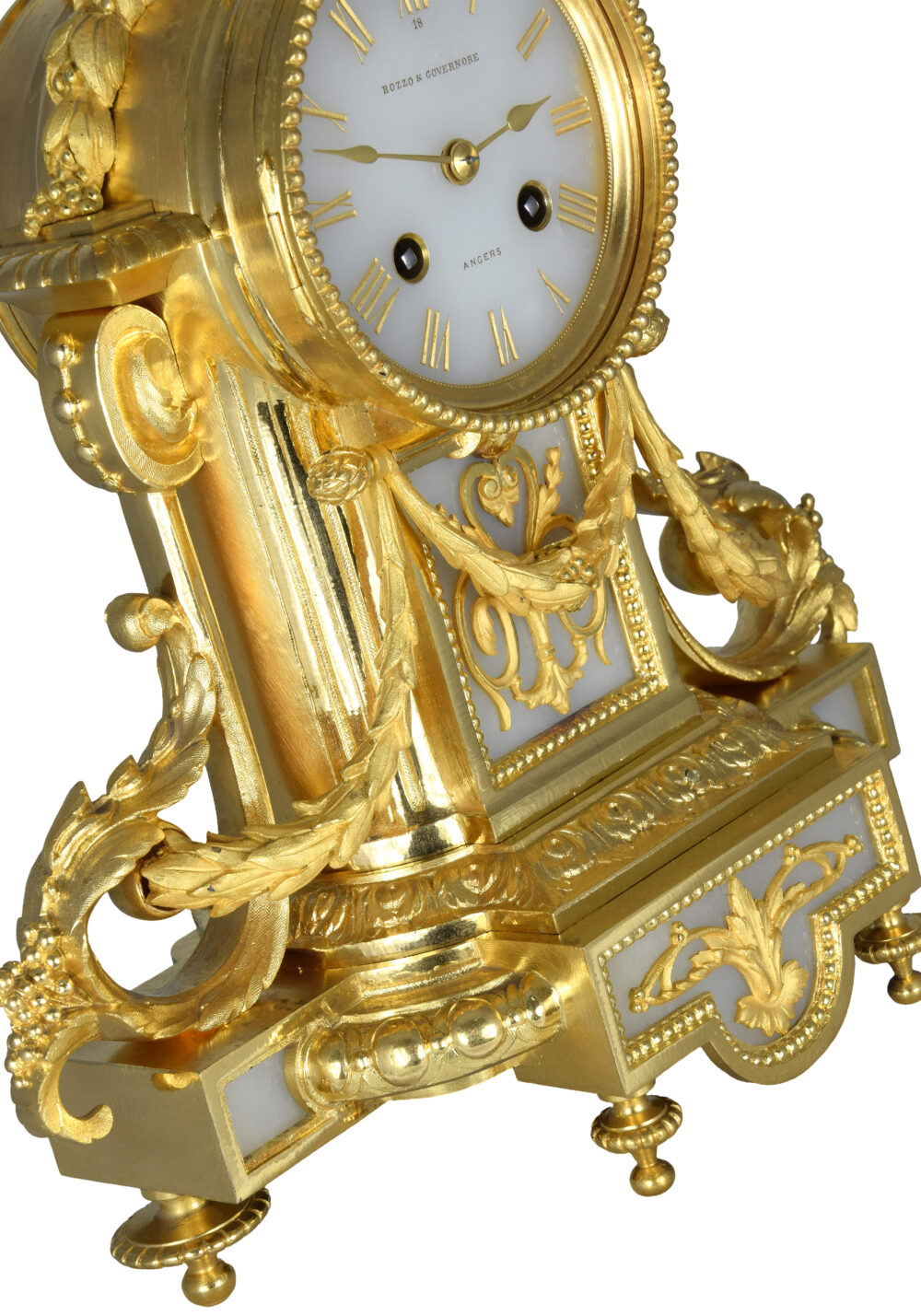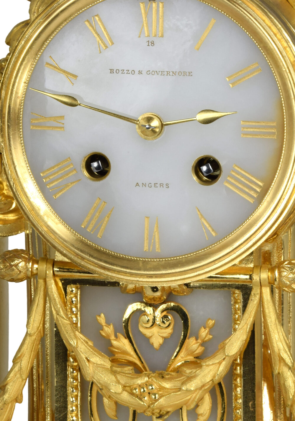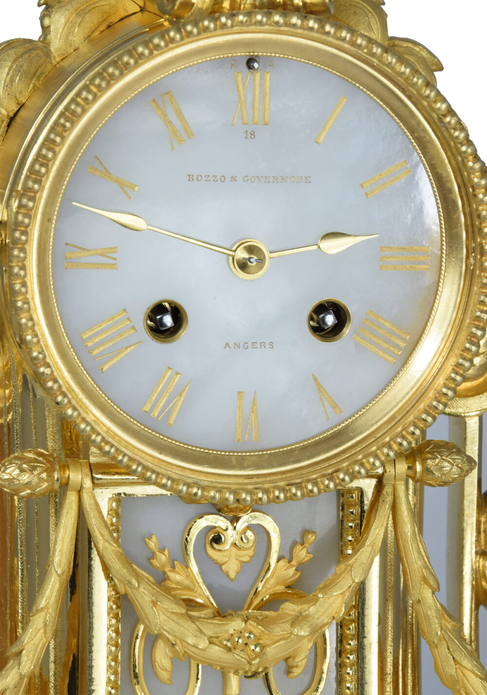Pendule de style Louis XVI, d’époque Napoléon III vers 1860 signé sur le cadran et mécanisme « Bozzo Governore à Angers » horloger référencé dans le Tardy, dictionnaire des horlogers à la date de 1850. Entièrement réalisée en bronze doré à l’or associé à des plaques en pierre blanche, onyx.
