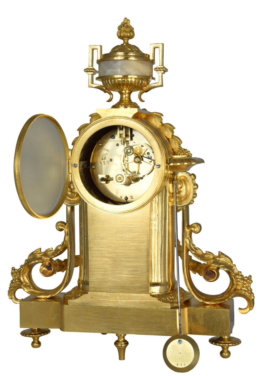 Le mouvement d’une pendule subit une révision complète par un démontage intégral, un nettoyage puis un polissage de chaque pièce. La durée de cette opération influence la brillance. Nous aimons obtenir un éclat brillant qui s’accorde avec la dorure de l’objet.