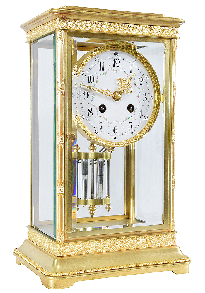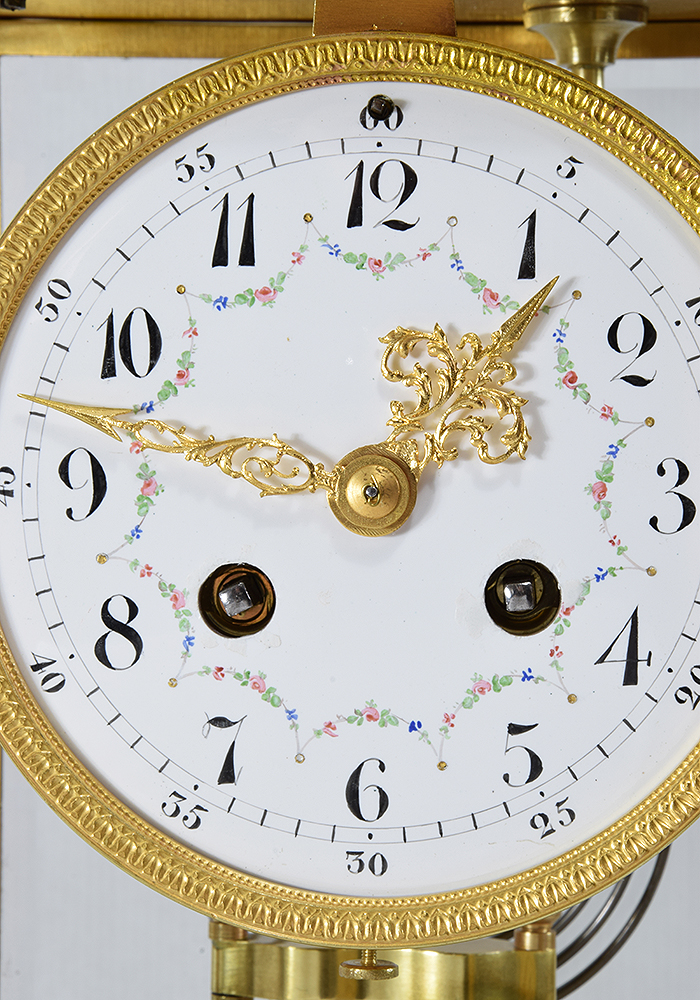 Pendule cage bien lumineuse, de belle manufacture, d’époque fin XIXème. Architecture en laiton et bronze doré, vernis incolore pour la protection contre l’oxydation. Quatre faces vitrées, verre épais, finition biseautée. Porte avant et arrière. Cadran en émail blanc décoré de guirlande de fleurs coloré.