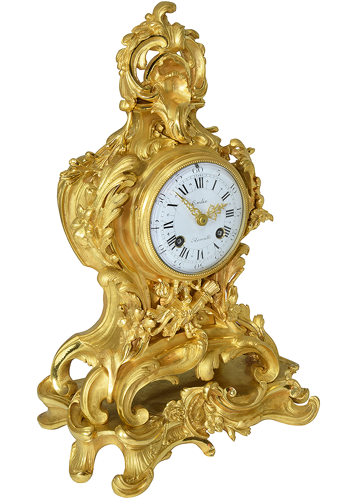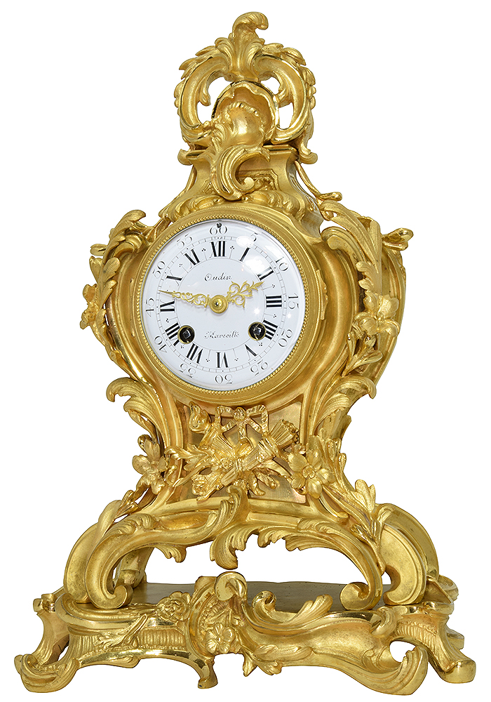 Pendule cartel de très bonne manufacture en bronze doré dans le style rocaille, d’époque Napoléon III. finement ciselé, bronze épais, architecture en rinceaux à décors de coquilles, agrafes et attributs de l’amour. Cadran bombé en émail blanc signé « Oudin à Marseille », fines aiguilles ajourées. L’ensemble protégé par une lunette à clapet serti d’un verre bombé.