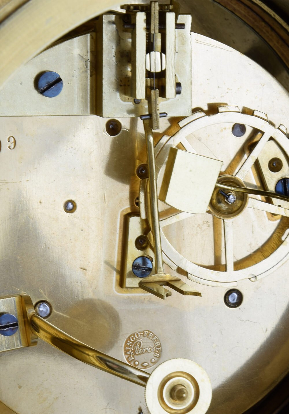 Le mouvement d’une pendule subit une révision complète par un démontage intégral, un nettoyage puis un polissage de chaque pièce. La durée de cette opération influence la brillance. Nous aimons obtenir un éclat brillant qui s’accorde avec la dorure de l’objet.