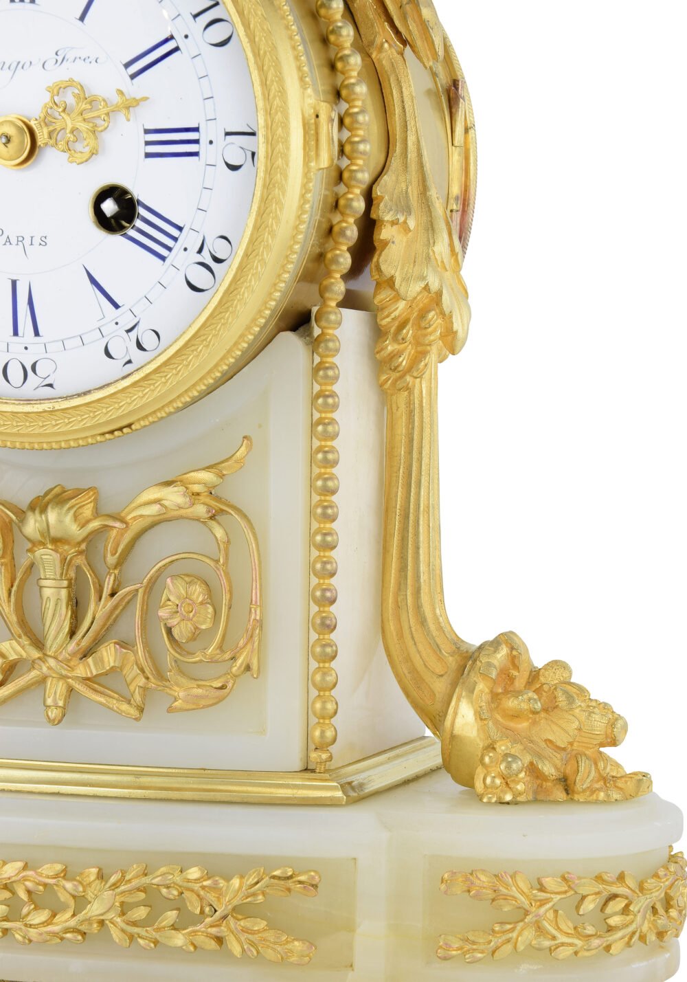 Il est entouré d’une monture en bronze doré ornée de frises végétales et de rangs de perles. Les chiffres romains bleuis et les aiguilles ajourées participent à l’élégance graphique de l’ensemble, tandis que la signature de l’horloger affirme l’origine parisienne et la qualité horlogère de la pièce.