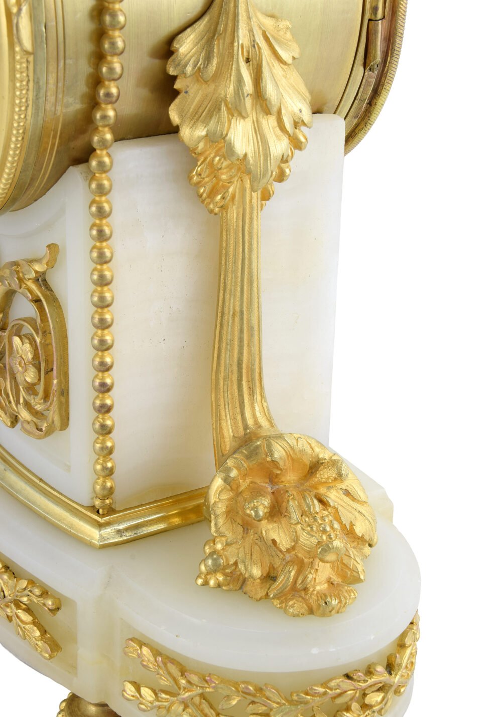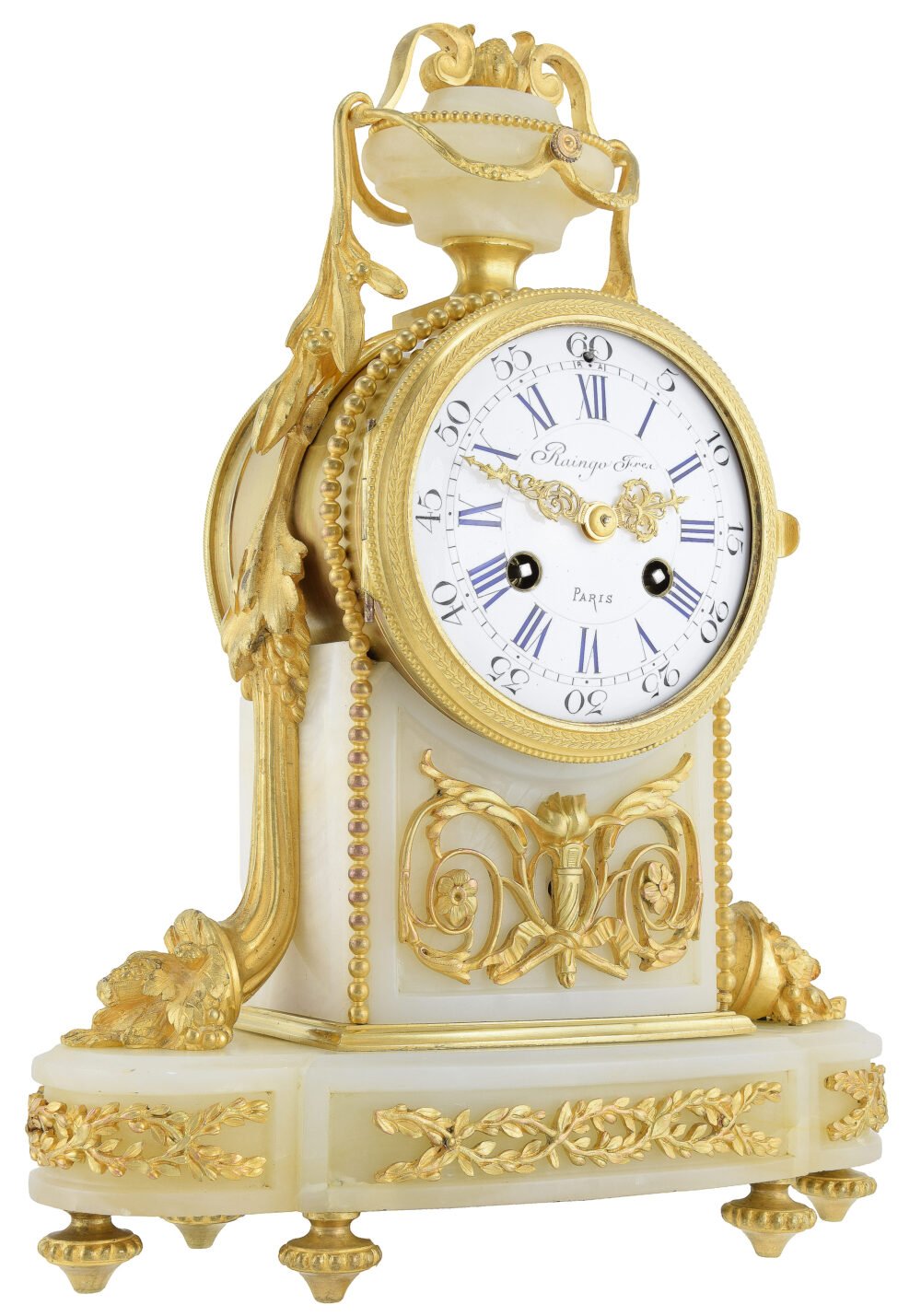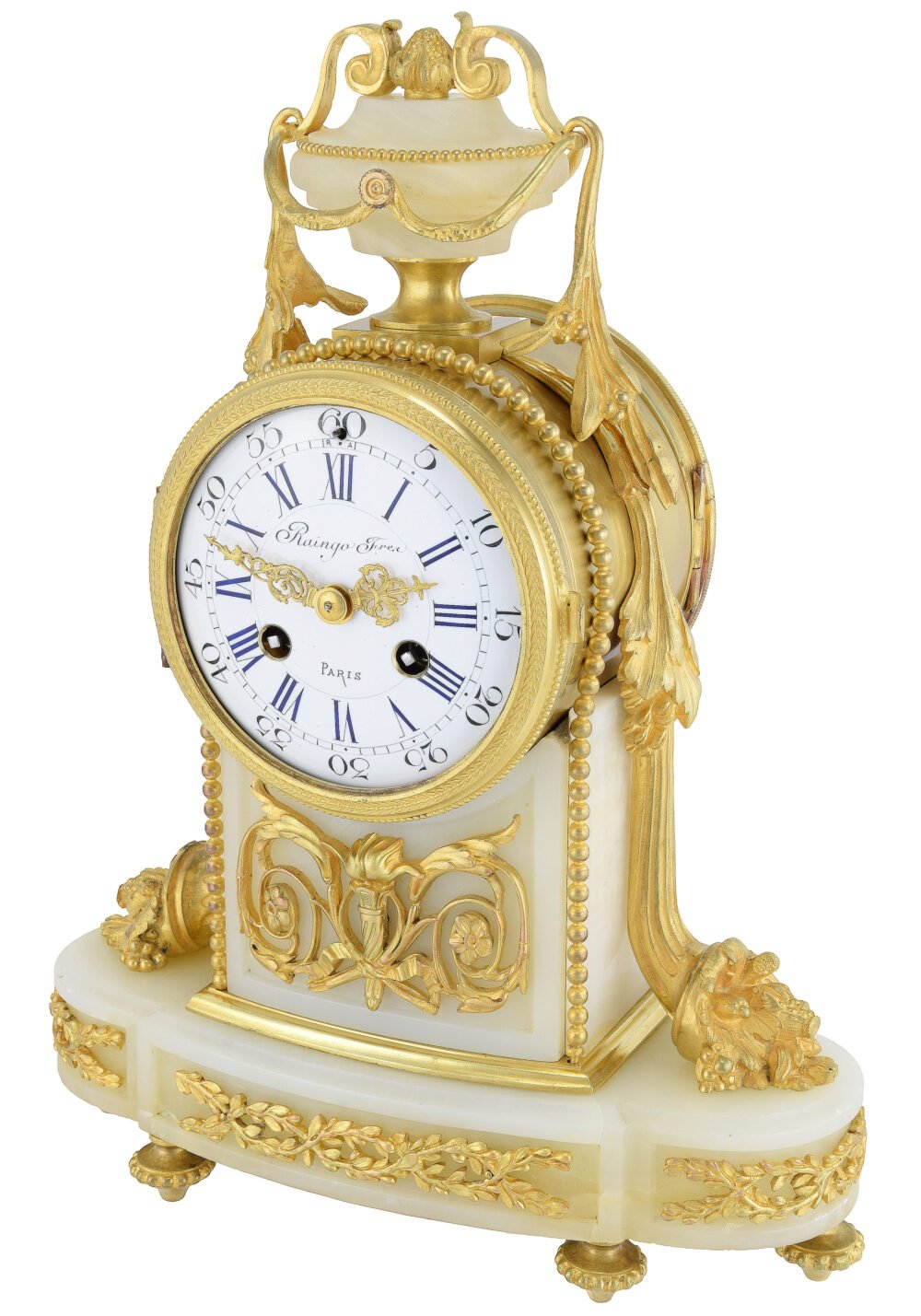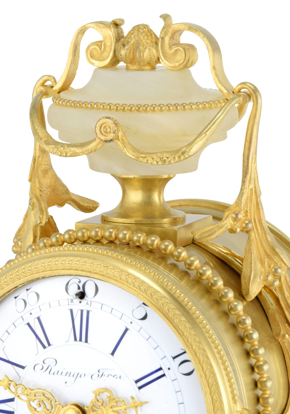 La partie supérieure adopte la forme d’un vase couvert reposant sur un piédouche, autre référence directe au répertoire Louis XVI. Des anses stylisées reliées par des guirlandes perlées soulignent ce couronnement, conçu comme l’aboutissement décoratif de l’élévation. Ce vase sommitale renforce l’idée d’un monument miniature, transformant la pendule en véritable élément d’architecture intérieure. Le contraste entre la chaleur lumineuse du bronze doré et la translucidité douce de l’onyx participe pleinement de l’esthétique du Second Empire, fondée sur l’association de matériaux luxueux et la recherche d’effets décoratifs sophistiqués. Les rinceaux, palmettes et guirlandes végétales qui animent le socle prolongent le thème de l’abondance déjà exprimé par les cornes d’abondance latérales, créant une unité iconographique cohérente. Ainsi, cette pendule incarne parfaitement l’esprit décoratif du règne de Napoléon III : une synthèse entre héritage néoclassique, symbolique décorative et excellence artisanale parisienne, où la précision horlogère de la maison Raingo Frères s’unit à une conception sculpturale faisant de l’objet non seulement un instrument de mesure du temps, mais une véritable œuvre d’art décoratif célébrant le luxe et l’abondance.