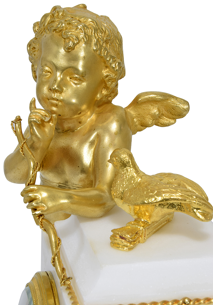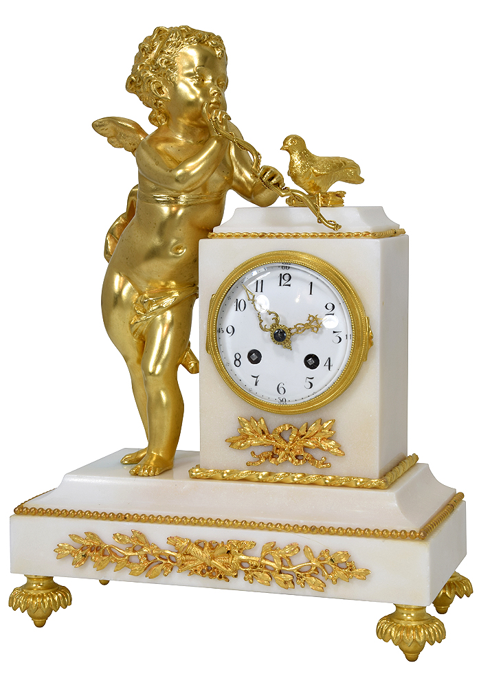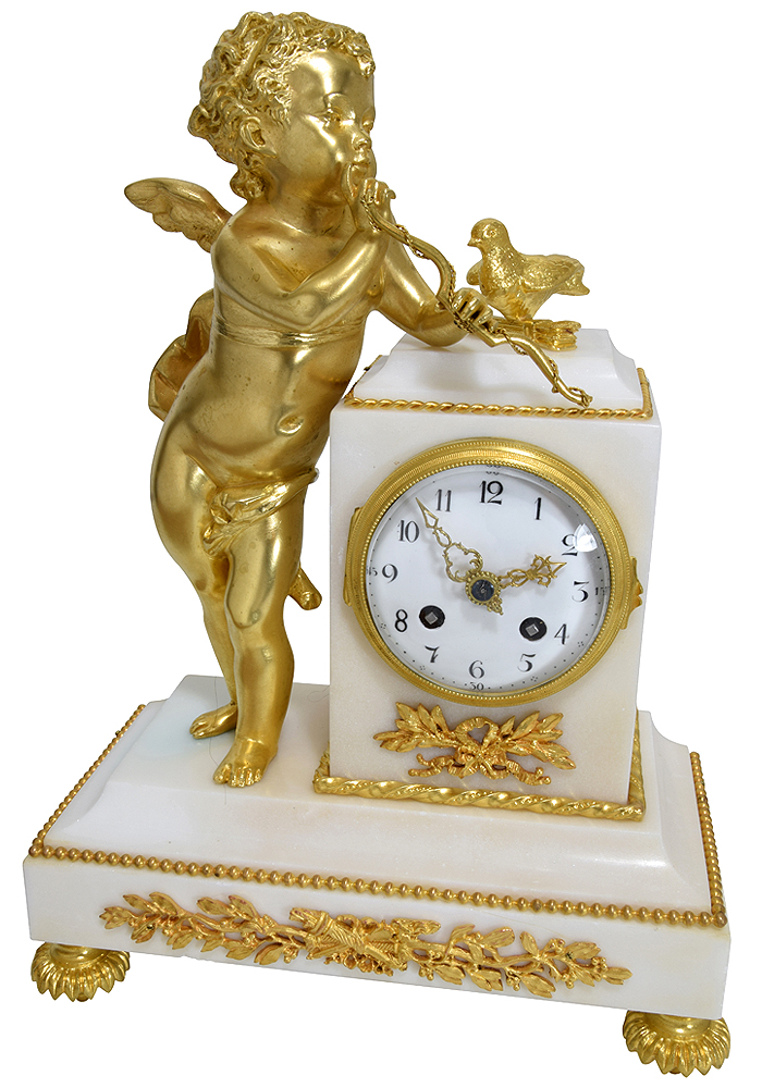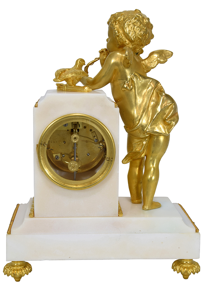 Belle pendule d’époque Napoléon III de style Louis XVI en marbre de carrare et bronze doré, finement ciselé. A décor d’une sculpture, d’un cupidon pensif tenant son arc à côté d’une colombe qui symbolise à eux deux l’amour et la fidélité.