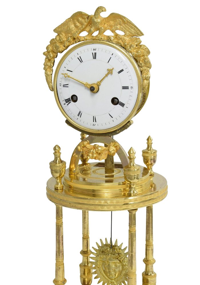 Elégante et rare pendule portique de forme cylindrique, architecte très « légère » à quatre colonnes. L’ensemble est recouvert d’une très belle dorure au mercure à l’or, brillante sur les surfaces lisse et amati sur les ciselures. La partie haute est ornée d’un aigle enroulant le cadran bombé en émail blanc accompagné d’aiguilles doré finement travaillé. L’espace entre les colonnes est occupé par un large balancier à figure d’Apollon, l’amplitude du balancier en fonctionnement est très grande. Époque Empire.