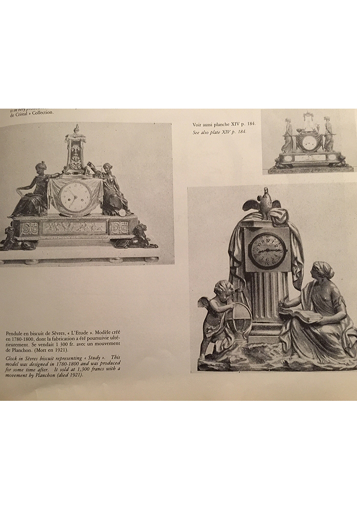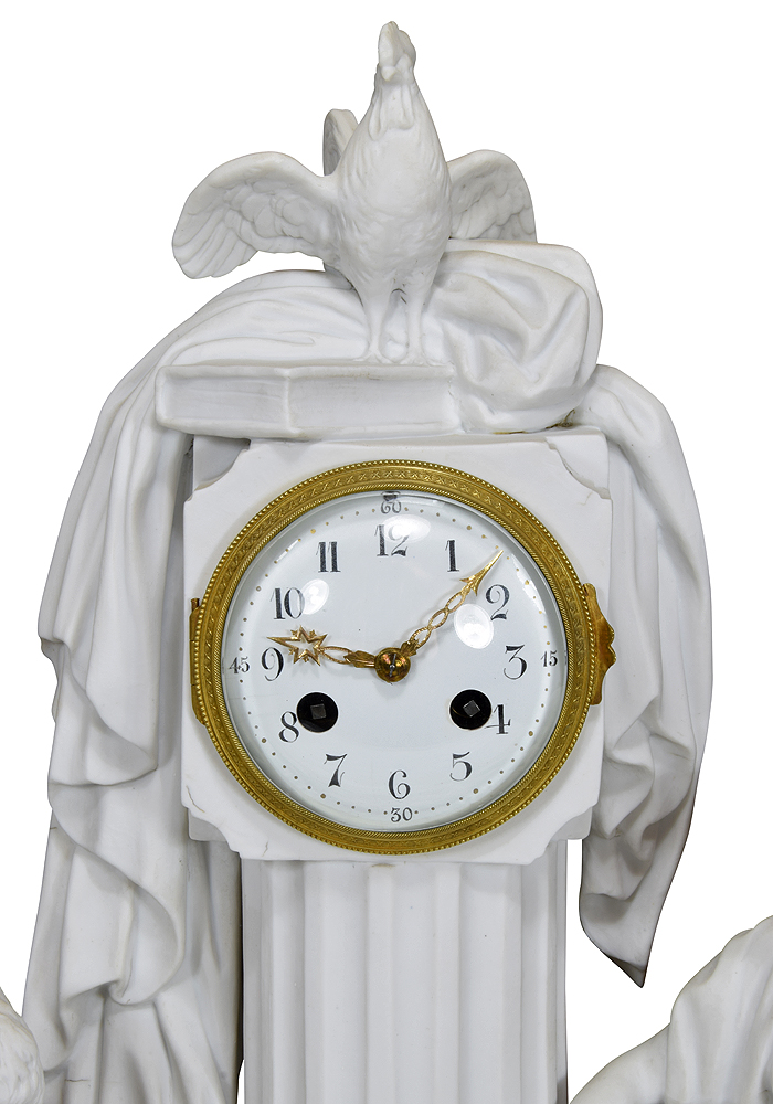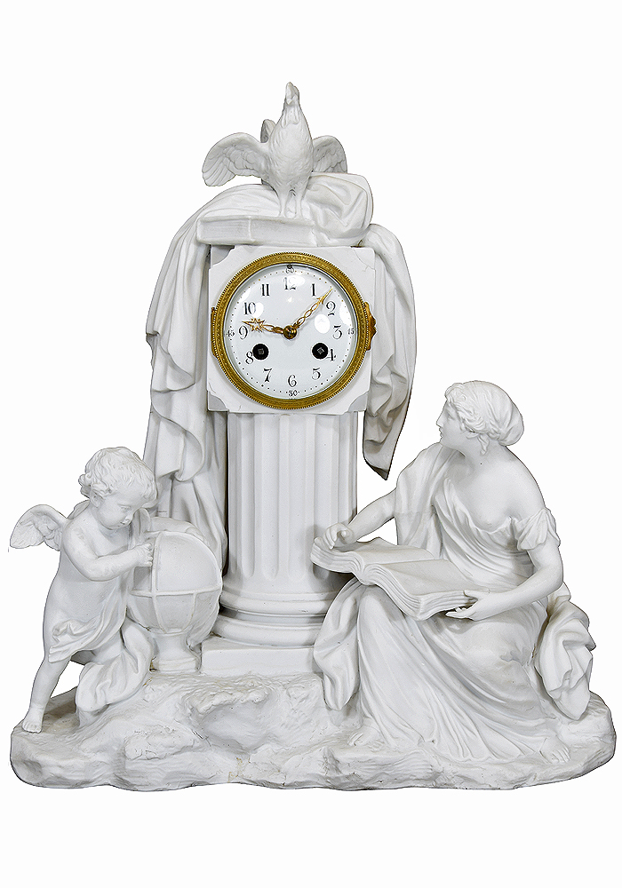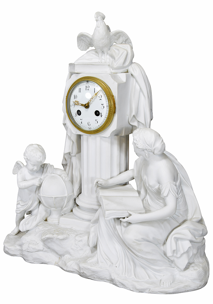 Pendule en biscuit « L’Etude de l’astronomie » milieu XIX ème de style Louis XVI, la muse Uranie enseigne l’astronomie à un ange devant un globe céleste, elle donne l’impression de regarder les heures situé en haut d’une colonne à l’antique, un coq surveille la scène. Le biscuit a gardé pureté et blancheur sans dommage.