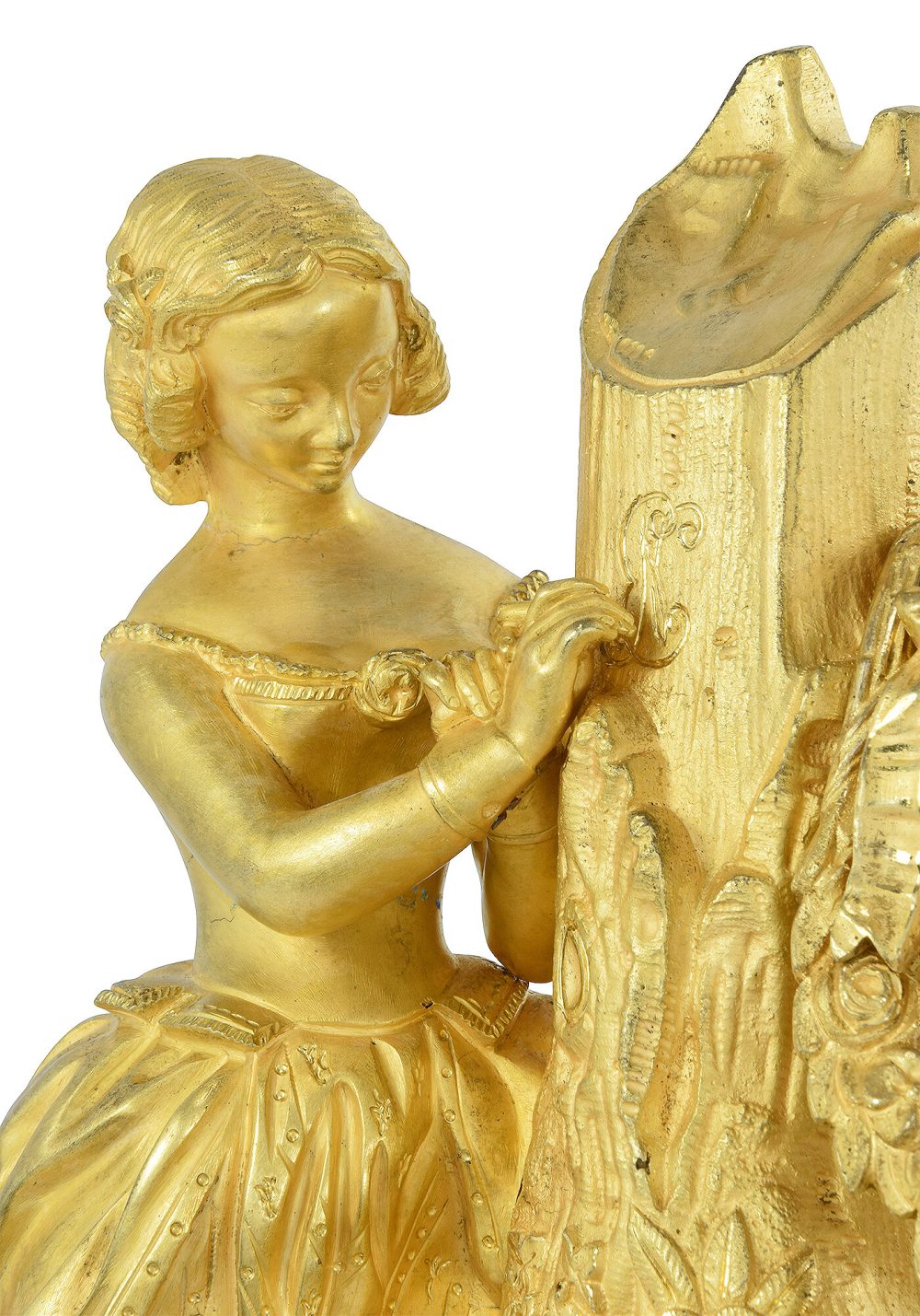 Pendule de qualité en bronze doré au mercure à l’or, d’époque Restauration vers 1820. Scène romantique à figure d’une jeune fille gravant des initiales sur un tronc d’arbre. Cadran en émail blanc ornementé d’un contour de perles. La façade est richement ciselée de volutes, feuille d’acanthe et de fleurs.