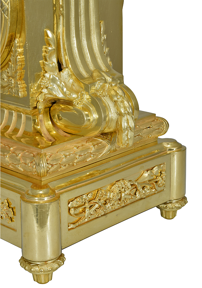 Base rectangulaire flanquée de quatre frises ciselées de flambeaux, couronnes, arcs et carquois.