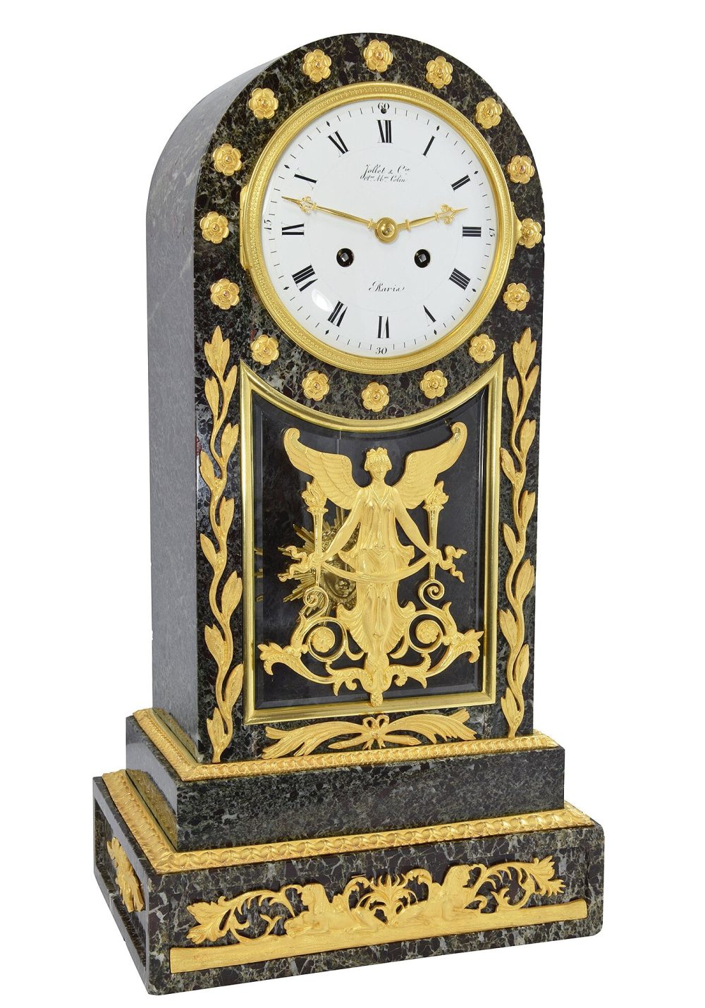 Une très belle pendule du début XXème de haute manufacture estampillée sur le cadran Jollet & Cie, Colin Paris, maison Colin est une prestigieuse fonderie d’art installé au 29 rue Sévigné à Paris, dirigée vers 1906-1907 par Jollet & Cie.