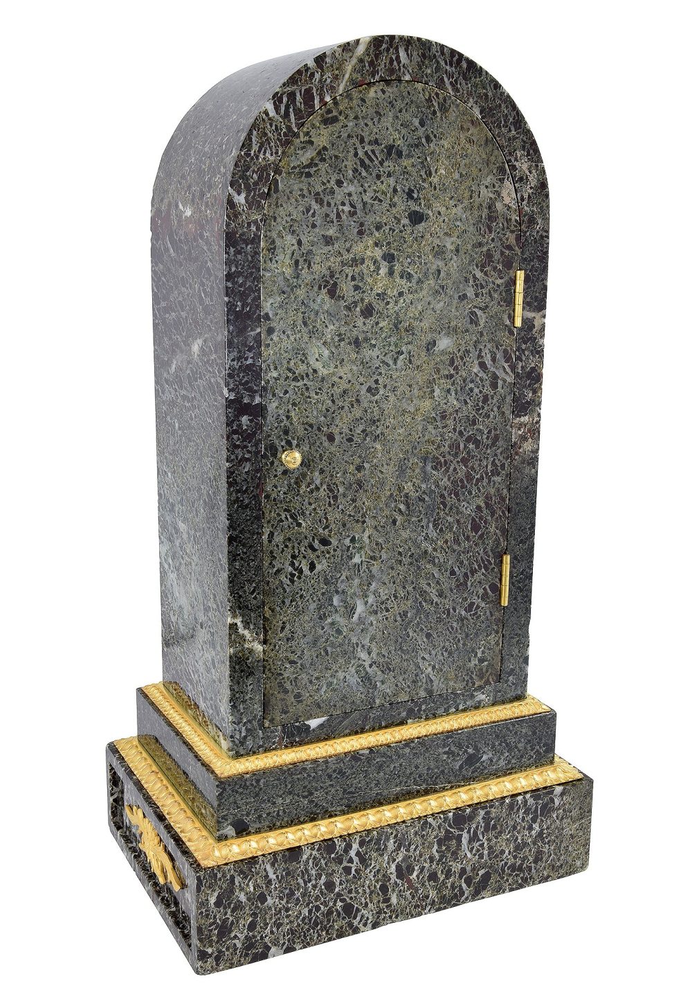 Architecture en marbre massif de couleur vert foncé moucheté de couleur blanc et noir, surface lisse et brillante. Ornementation de qualité en bronze doré finement ciselé à décor typiquement empire tel que rosaces, feuilles d’eau, sphinx et palmette.