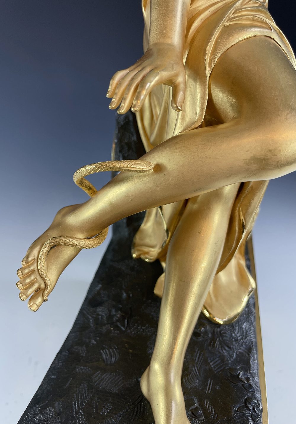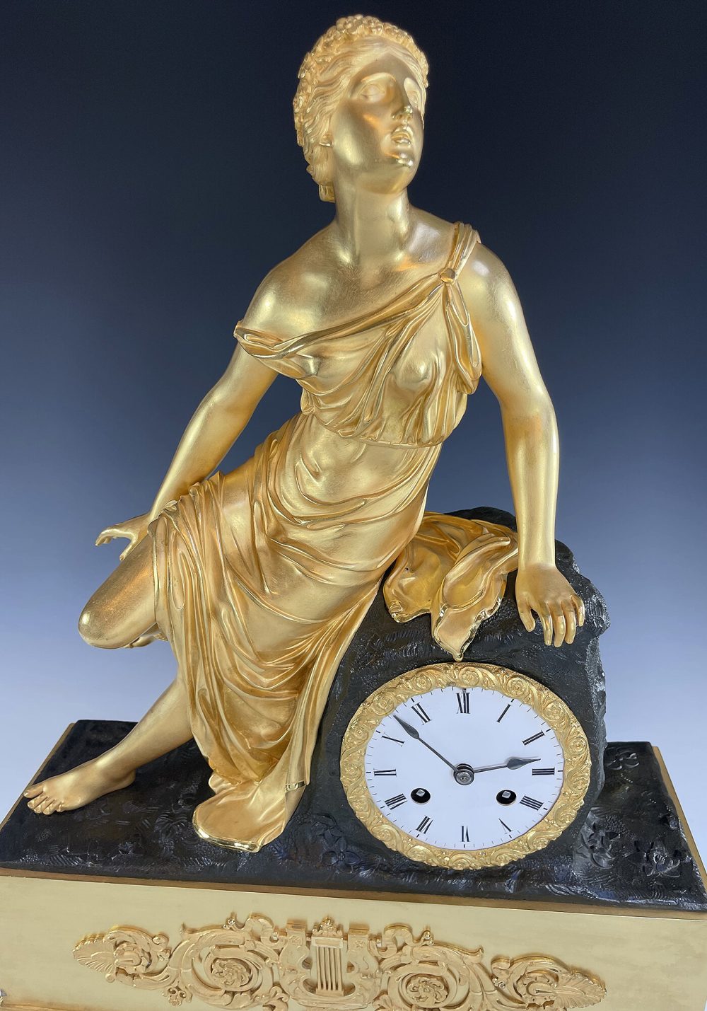Imposante pendule d’époque Restauration vers 1840. Thème mythologique, en bronze doré au mercure à l’or, grande sculpture finement travaillée à figure d’Eurydice musicienne et épouse d’Orphée, sur un rocher en bronze patiné avec un serpent enroulé à sa cheville. Cadran en émail blanc souligné par un contour ciselé de rinceaux. L’ensemble repose sur une large base ornementé d’un contour de palmettes et d’une frise, ciselée au centre d’une lyre appartenant à Orphée.