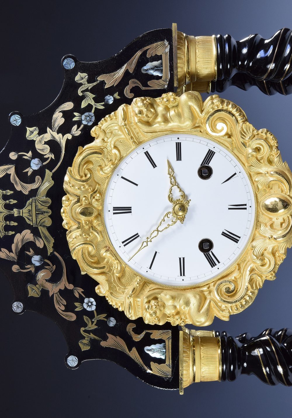 D’excellente qualité en tous points, architecture en placage de bois d’ébène noir à quatre colonnes torsadé agrémenté de filets de laiton, ainsi qu’une splendide marqueterie finement travaillée en façade avec une riche incrustation de laiton doré et de nacre colorée. L’ensemble de la pendule a bénéficié d’un vernis au tampon apportant contraste, brillance et protection.