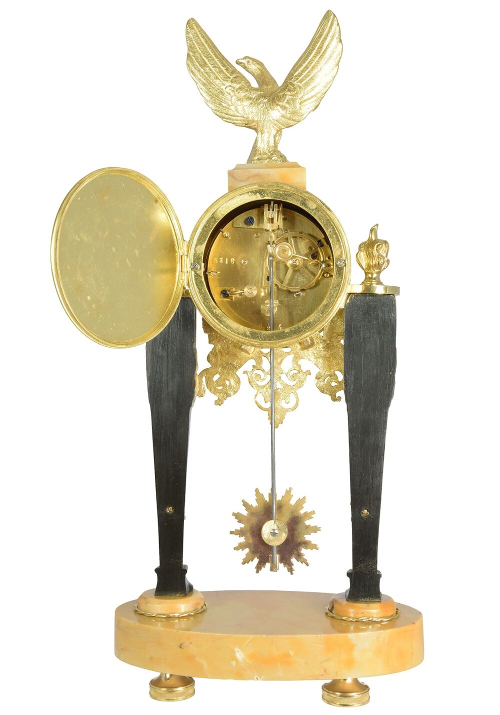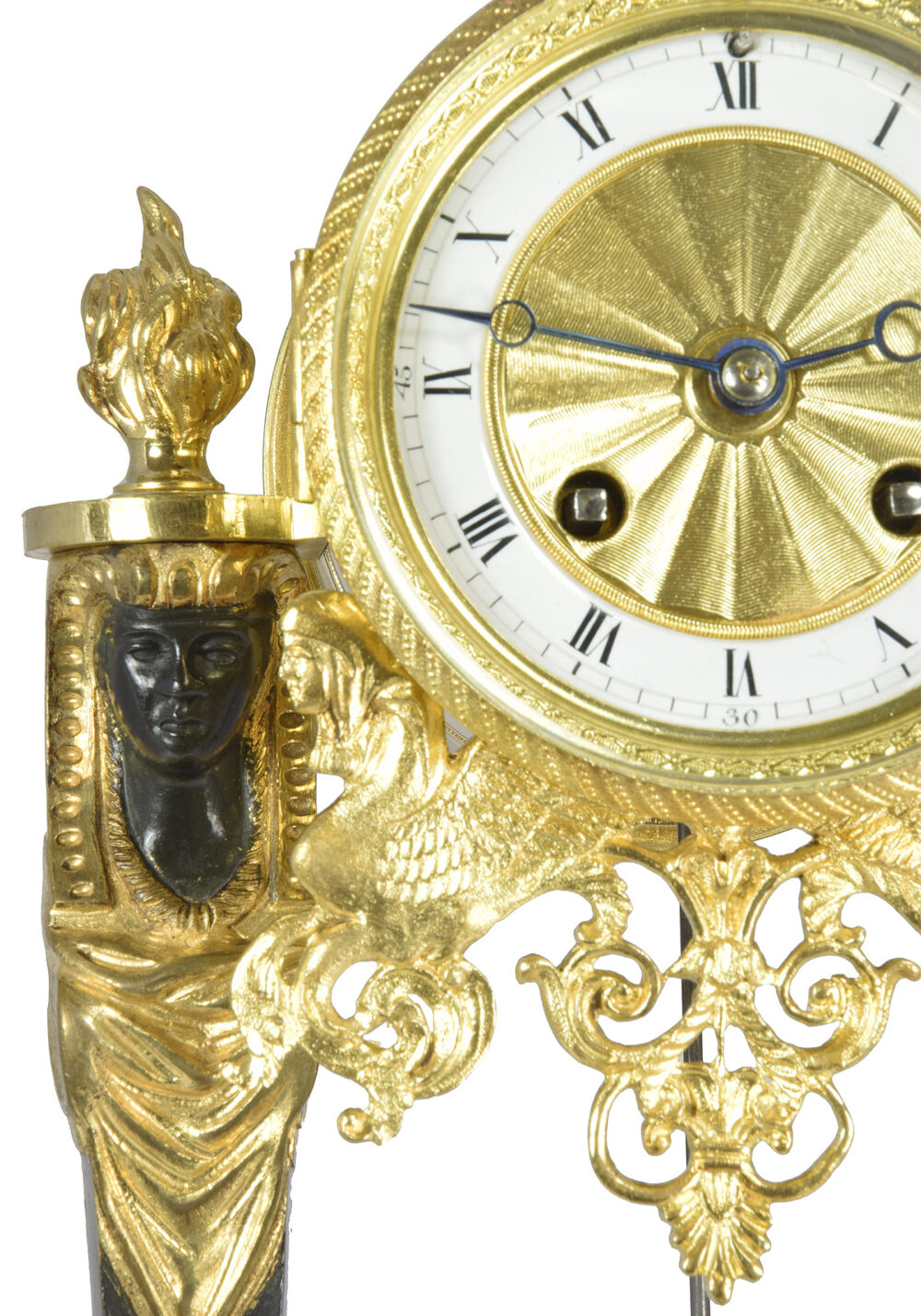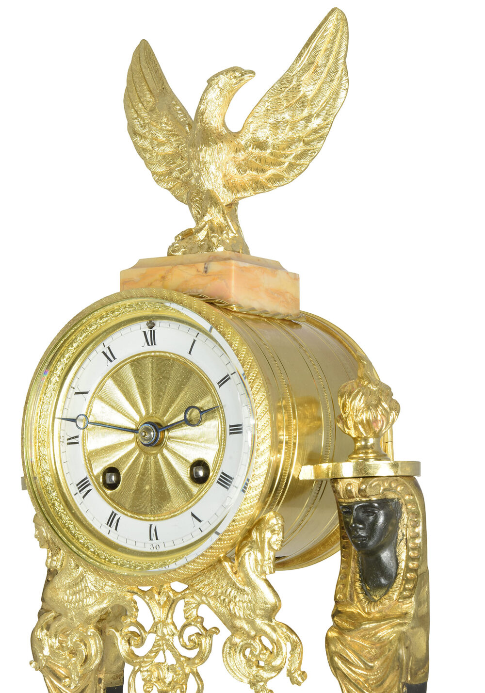 Pendule portique de style Empire, retour d’Égypte, d’époque Napoléon III vers 1880. Bronze doré et bronze patiné, buste d’Égyptien en guise de colonnes soutenant le cadran en émail blanc et protégé par un verre, orné au sommet d’un aigle triomphant. L’espace entre les colonnes est occupé par un balancier soleil. Base ovale en marbre sienne ornée d’une longue frise de rinceaux et de cygnes s’abreuvant à une fontaine.