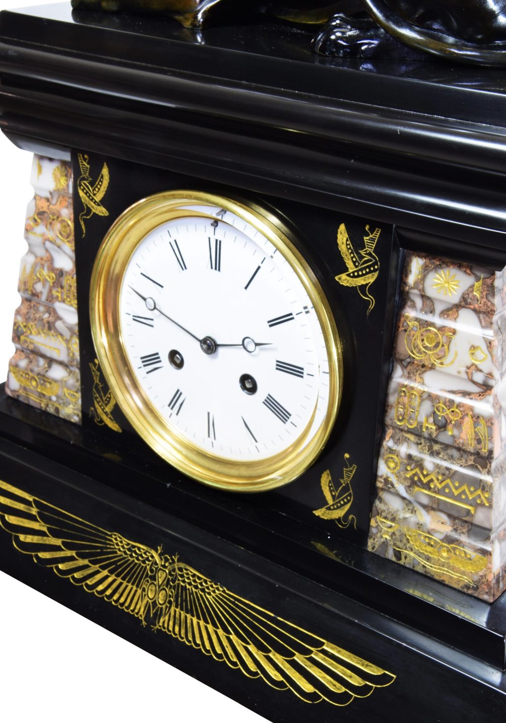 Sublime pendule dans le style empire, retour d’Égypte, d’époque Napoléon III. Imposante architecture en marbre noir et blanc veiné ornementé sur la façade d’un magnifique travaillé de hiéroglyphes gravés dans le marbre, ciselure d’une grande précision apportant un attrait très intéressant et très décoratif. La Base est ornée d’ailes déployées d’Isis. Chaque hiéroglyphe est surligné par une peinture couleur or extra brillance.