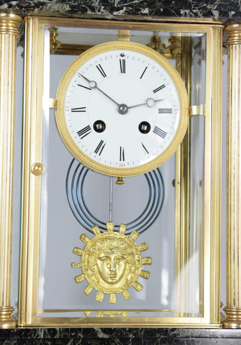 À travers les parois vitrées, on découvre un pendule d’apparat en bronze doré représentant un visage rayonnant, probablement inspiré du dieu solaire Apollon ou du Soleil Louis XIV. Ses rayons ciselés créent des jeux de lumière délicats lors du mouvement du balancier, renforçant l’aspect précieux de l’ensemble.