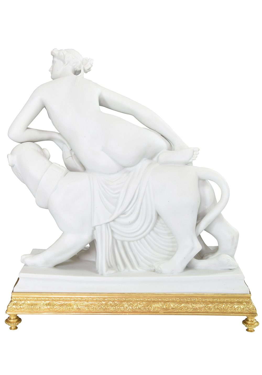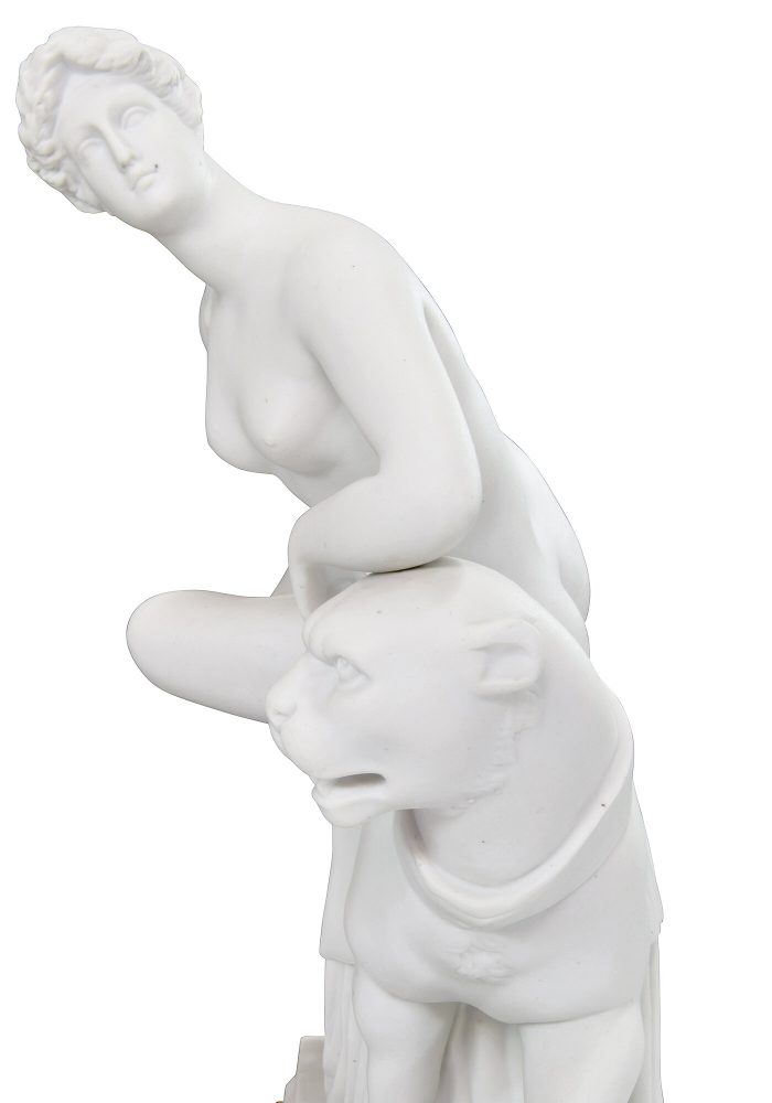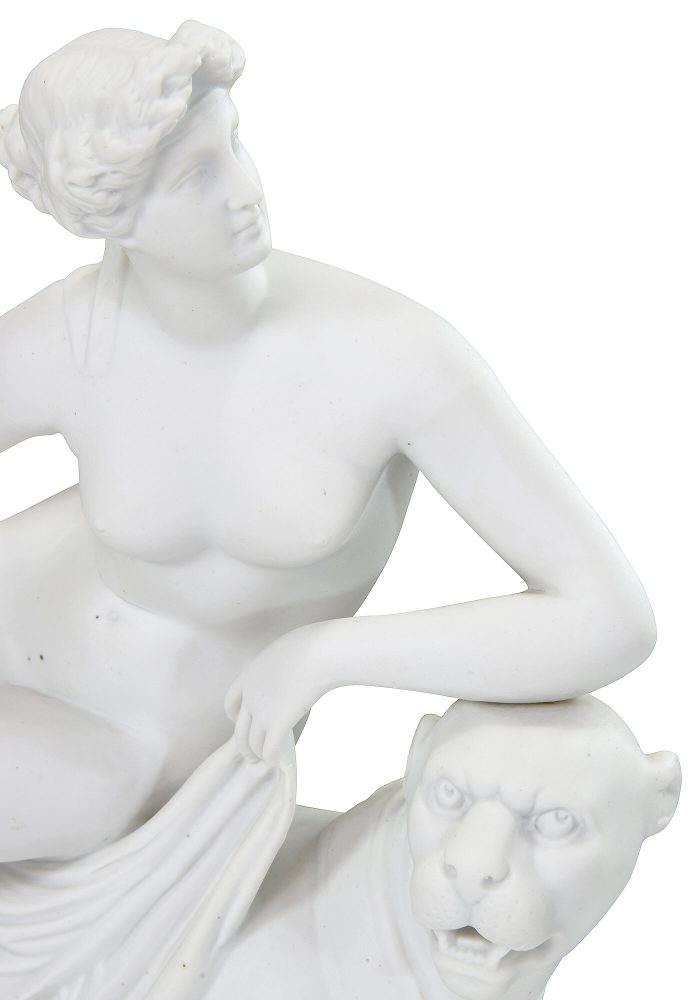 Intéressante sculpture en biscuit à figure de la princesse Ariane sur une panthère avec un drapée.