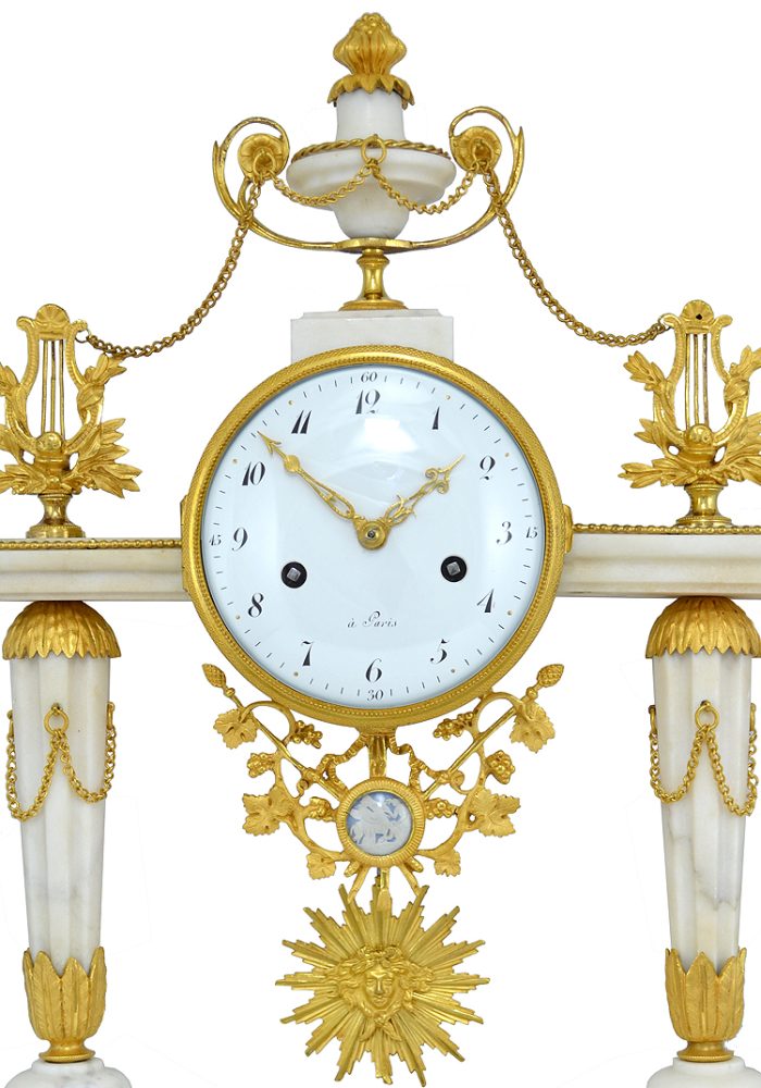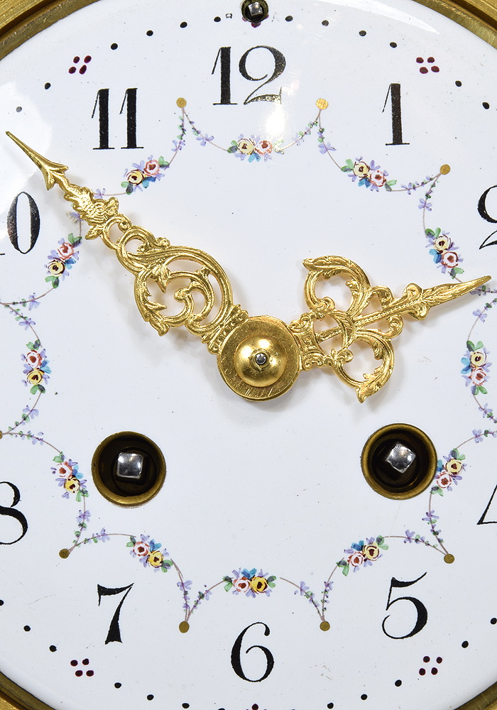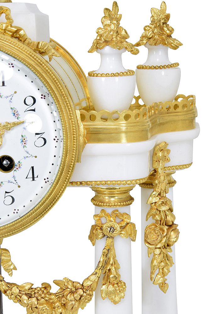 Elégante pendule portique d’époque Napoléon III dans le style Louis XVI. Architecture en marbre blanc de carrare et d’une belle ornementation en bronze doré de vases et guirlandes fleuries. L’espace entre les colonnes est occupé par un balancier soleil. Cadran bombé en émail blanc décoré en peinture de fleurs colorées, lecture de l’heure par des aiguilles dorées finement travaillées.