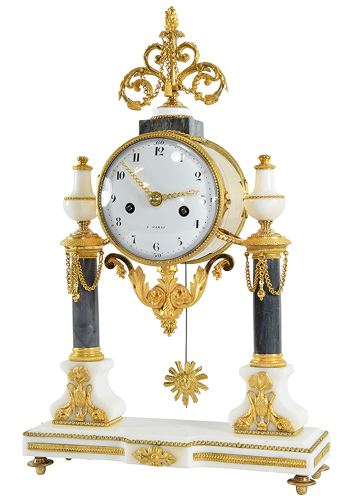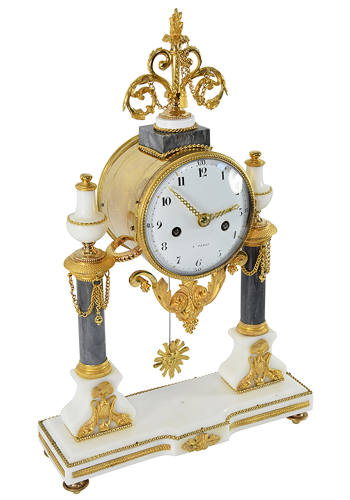 Elégante pendule portique du XVIIIème siècle, d’époque Louis XVI. Constitué de marbre et d’une fine ornementation en bronze doré au mercure, finement ciselé.
