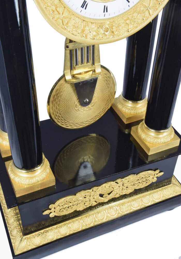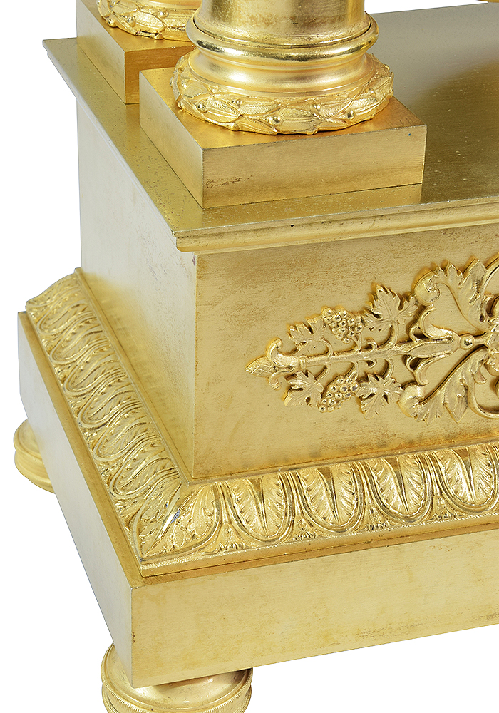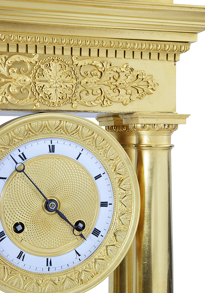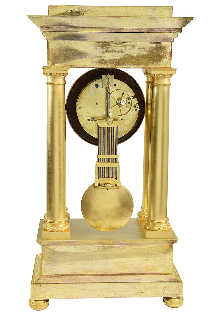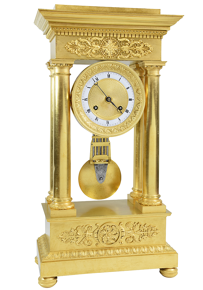 Grande pendule portique en bronze doré au mercure d’époque Restauration, En bronze doré au mercure, architecture à quatre colonnes ornées de chapiteaux. L’entablement finement travaillé est ciselé d’une frise et d’un contour de rognon et de petit carré. Large cadran en émail blanc serti au centre d’un disque plat guilloché, épais entourage d’un contour ciselé de feuille d’eau. L’espace entre les colonnes est occupé par un balancier « Berthoud » à lentille. Base rectangulaire sicelée de végétaux.