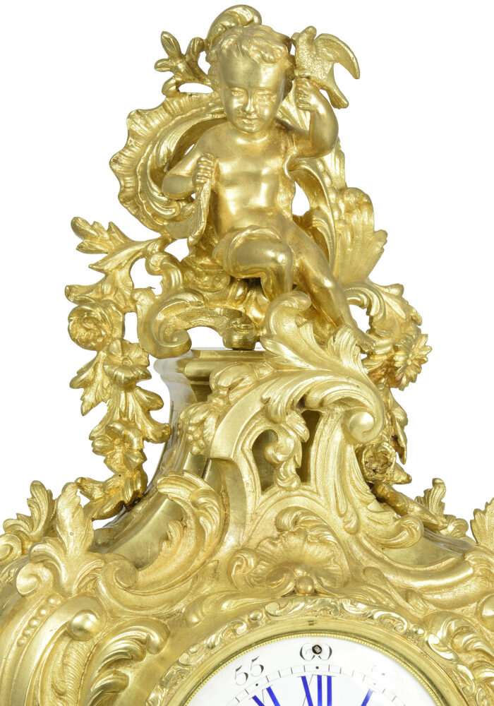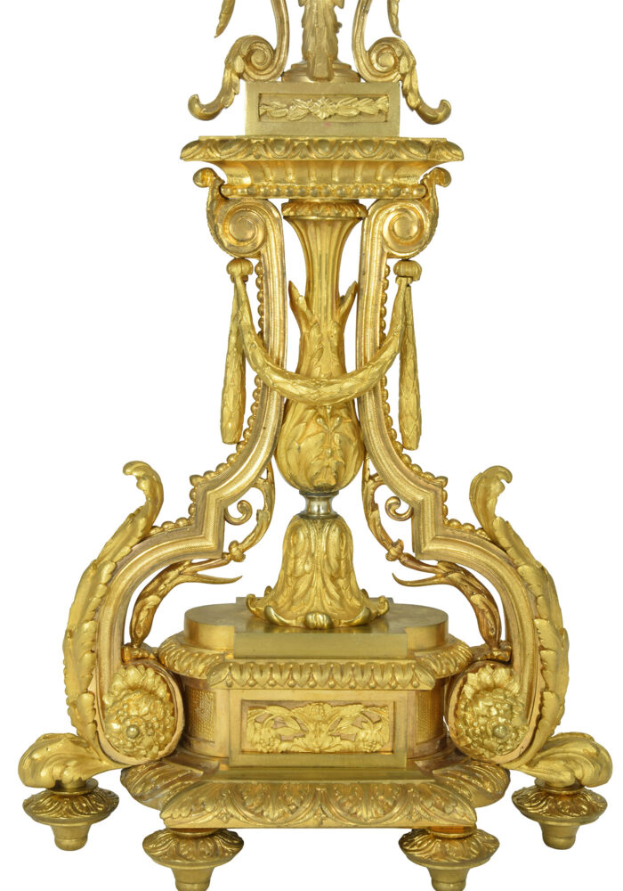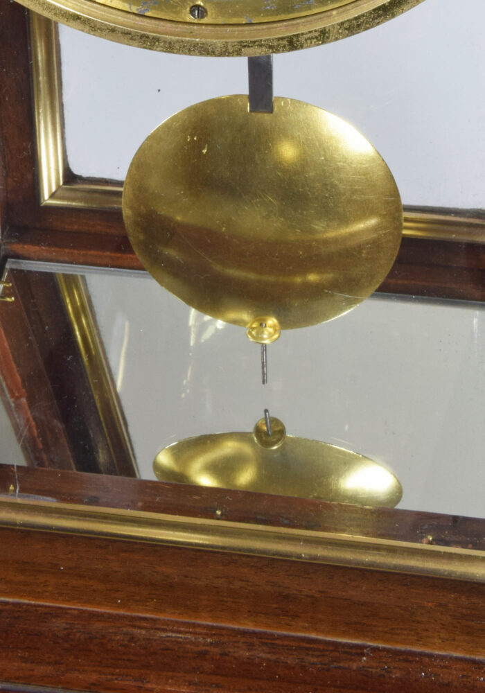 Le mouvement d’une pendule subit une révision complète par un démontage intégral, un nettoyage puis un polissage de chaque pièce. La durée de cette opération influence la brillance. Nous aimons obtenir un éclat brillant qui s’accorde avec la dorure de l’objet.