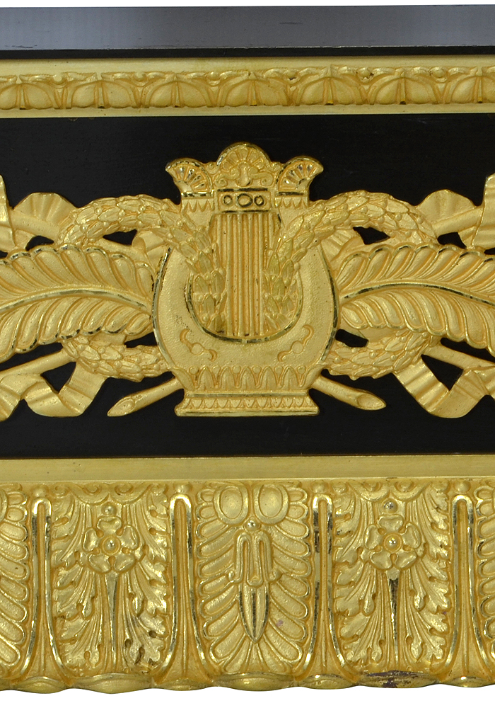 Surprenante qualité de la dorure au mercure et de la finesse de la sculpture, constitué de bronze patiné pour les parties lisses et de bronze doré au mercure. Décor principal de la musique avec divers instruments représentés sur les bas-reliefs et sur le balancier. Cadran en bronze argenté souligné par un entourage ciselé et un second portant l’ensemble.