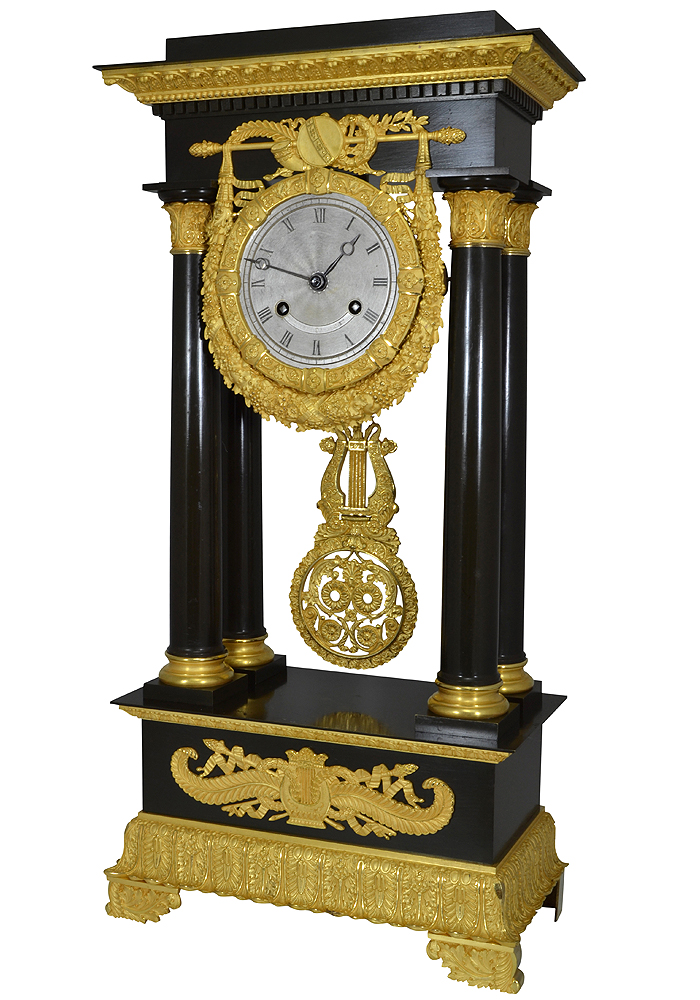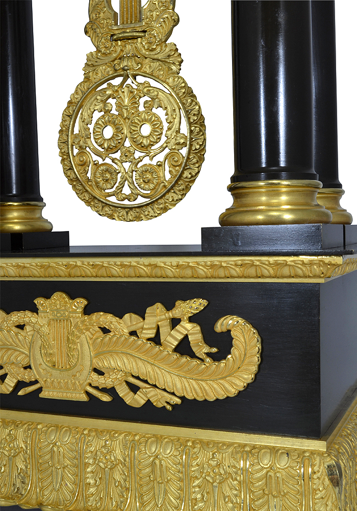 Très belle pendule portique d’époque Restauration vers 1820 signé sur le cadran et la platine du mécanisme « Moinet Aîné à Paris » 1806-1820, horloger référencé dans le Tardy, dictionnaire des horlogers.