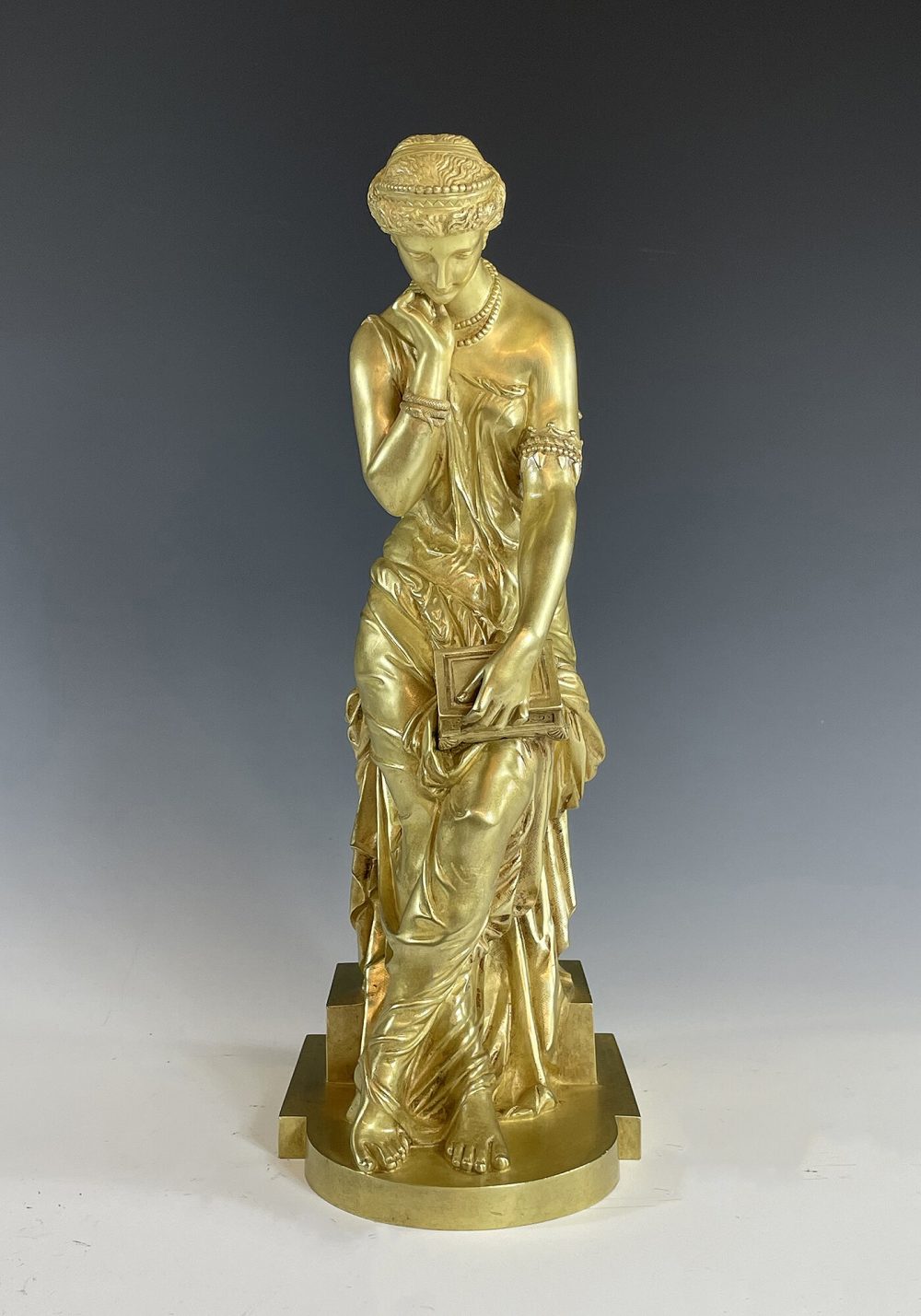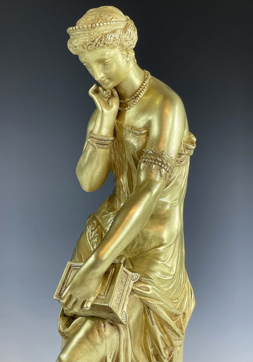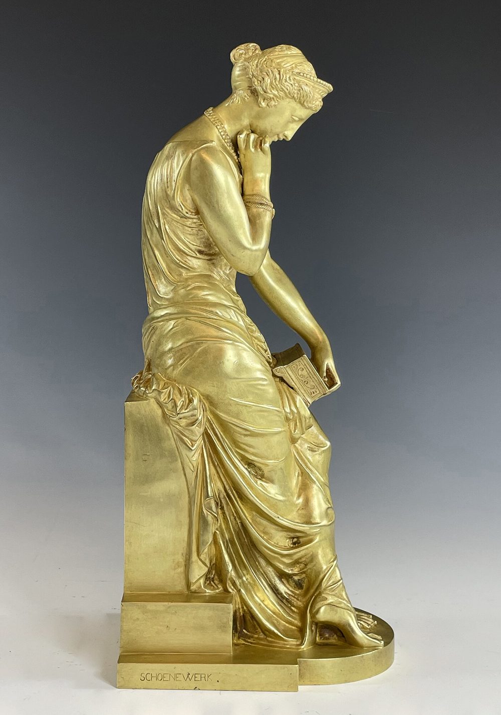 Mythologie Grec, sculpture en bronze doré à figure de Pandore drapé à l’antique dotée d’un bracelet en serpent, visage angélique regardant une boîte qu’elle tient d’une main. Signé sur la terrasse « SCHOENEWERK »