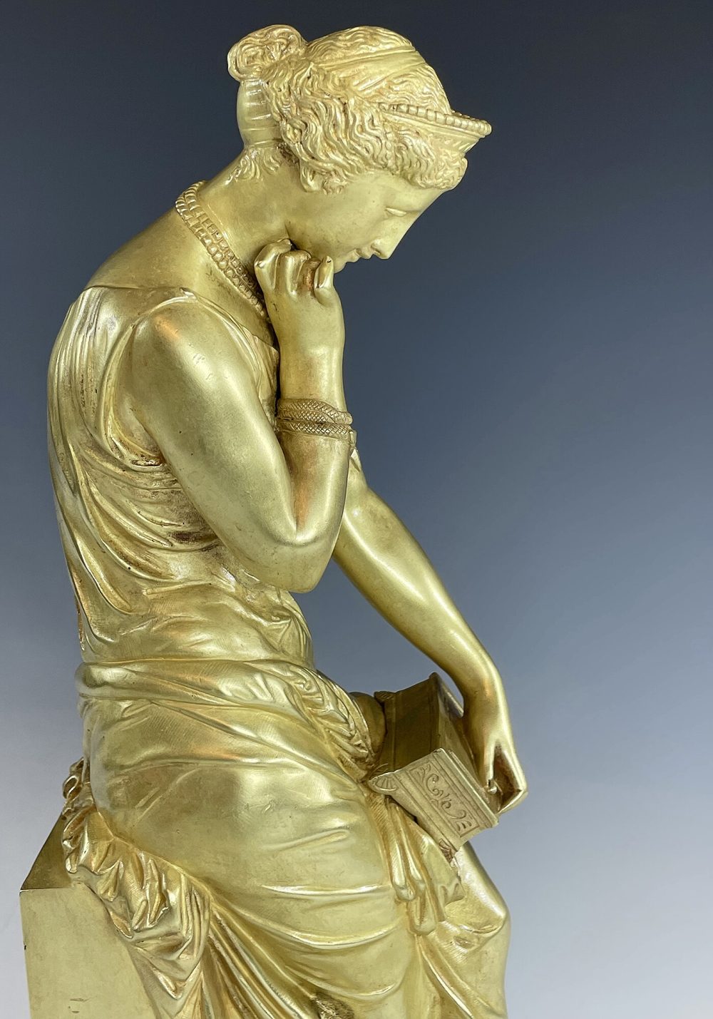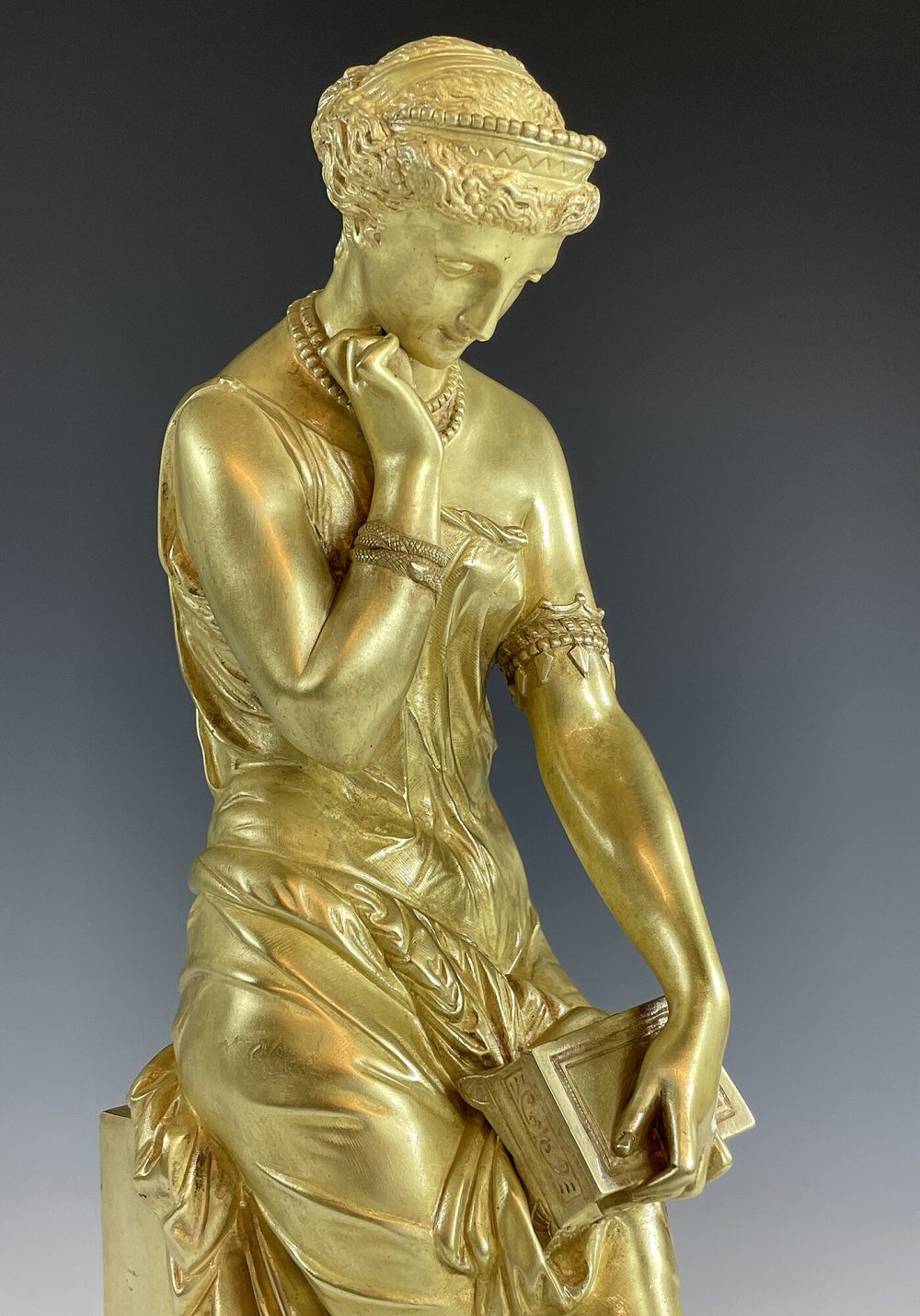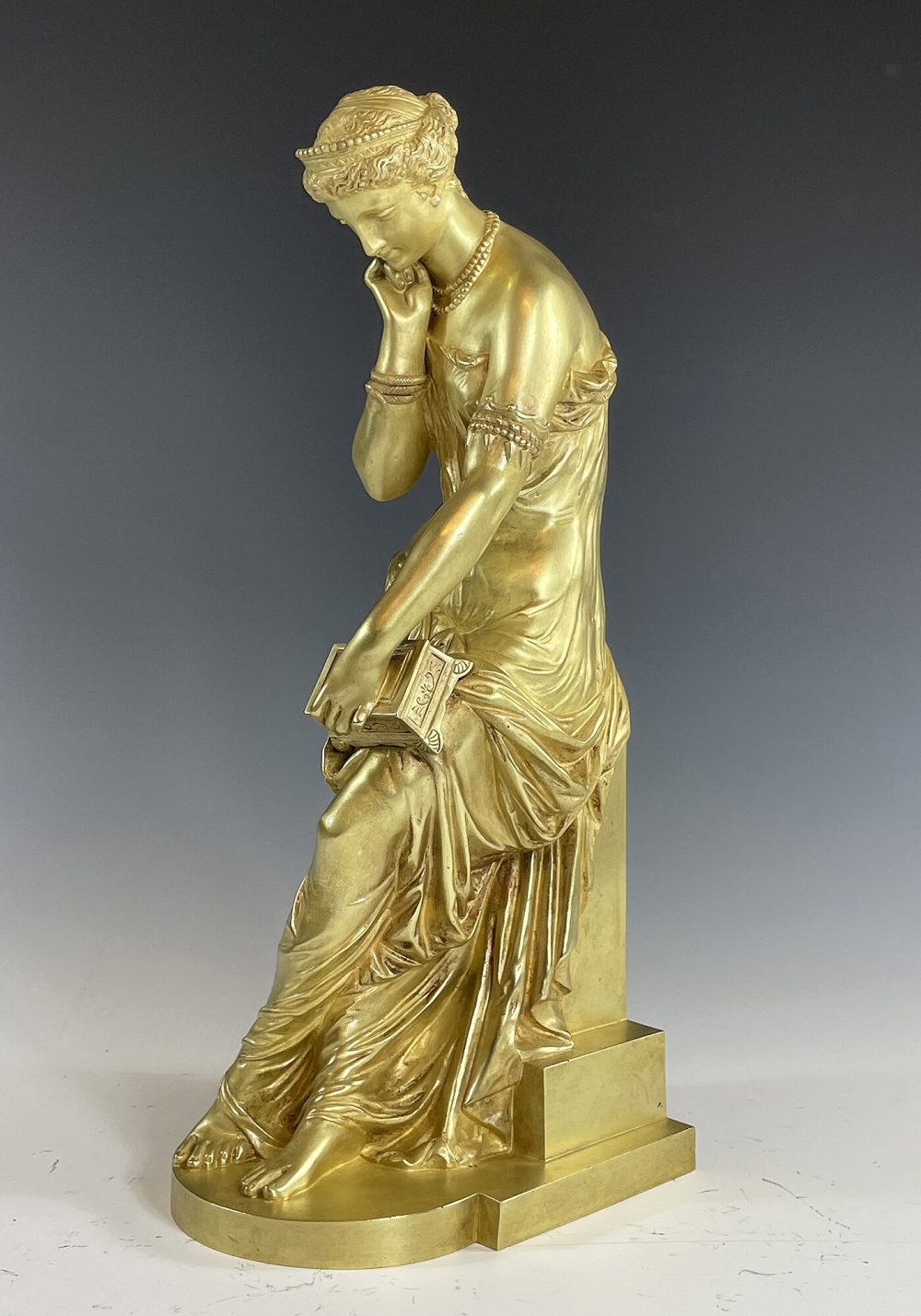 Mythologie Grec, sculpture en bronze doré à figure de Pandore drapé à l’antique dotée d’un bracelet en serpent, visage angélique regardant une boîte qu’elle tient d’une main. Signé sur la terrasse « SCHOENEWERK »
