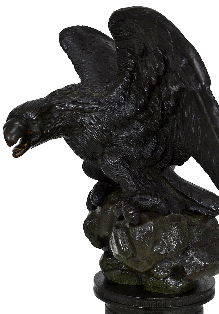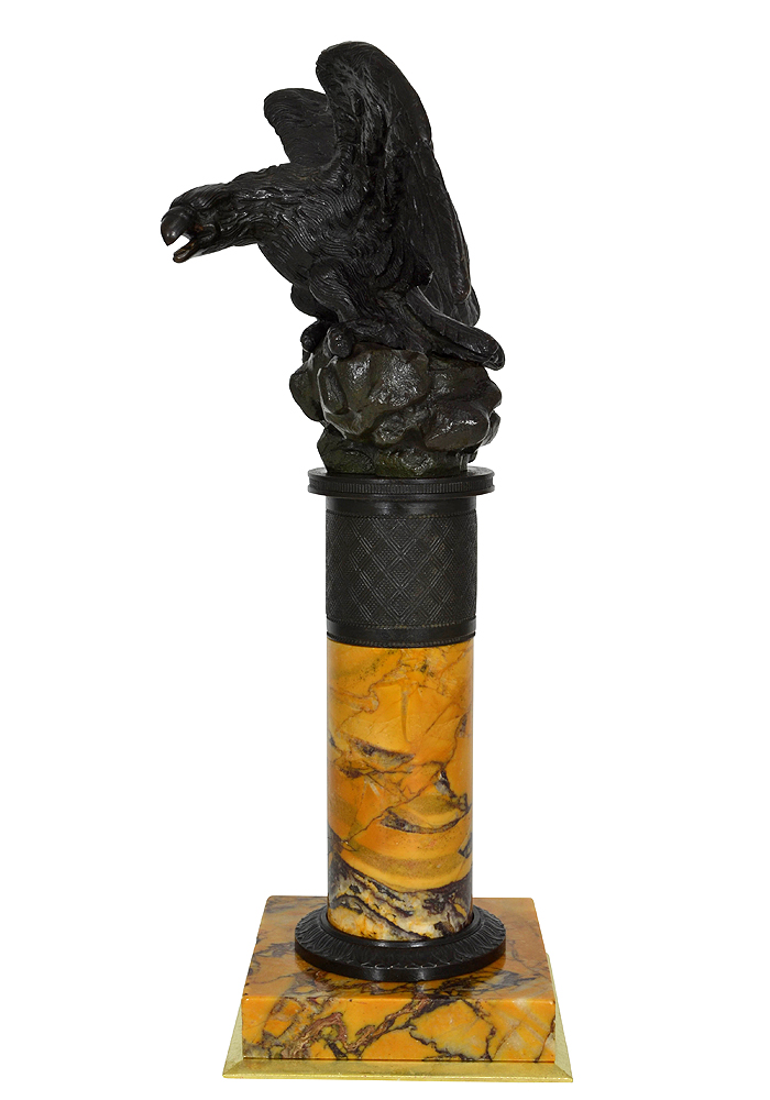 Sculpture en bronze patiné noir d’un aigle royal aile déployé sur un rocher en bronze patiné vert, l’ensemble repose sur une colonne en marbre de sienne surmontée d’un chapiteau guilloché et d’une base ciselé de feuilles d’eau. Epoque restauration vers 1820.