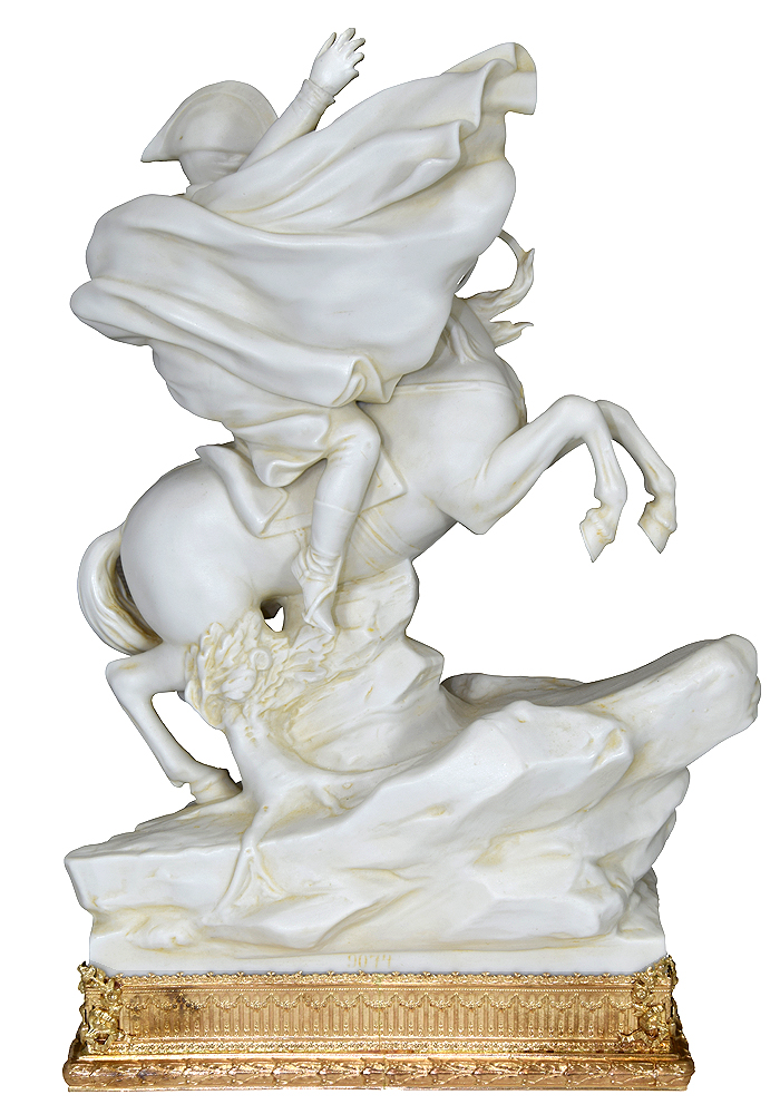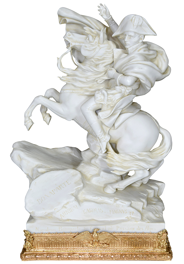 Sculpture en biscuit reposant sur un socle ciselé en bronze doré à décor d’un aigle. Sculpture de belle qualité en parfait état, comporte de nombreuses inscriptions telles que « Napoléon Bonaparte 1er consul au passage des alpes ». Epoque Napoléon III.