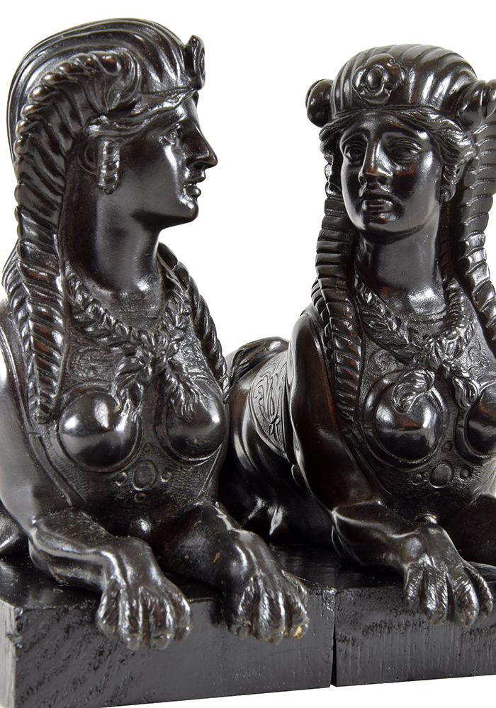 De très belles manufactures en bronze patiné sur socle en bois (postérieur). Paire de sphinx, en pendant, finement ciselé, les pattes sortent de la base. Objet très décoratif et de qualité, dans le style Régence d’époque Napoléon III.
