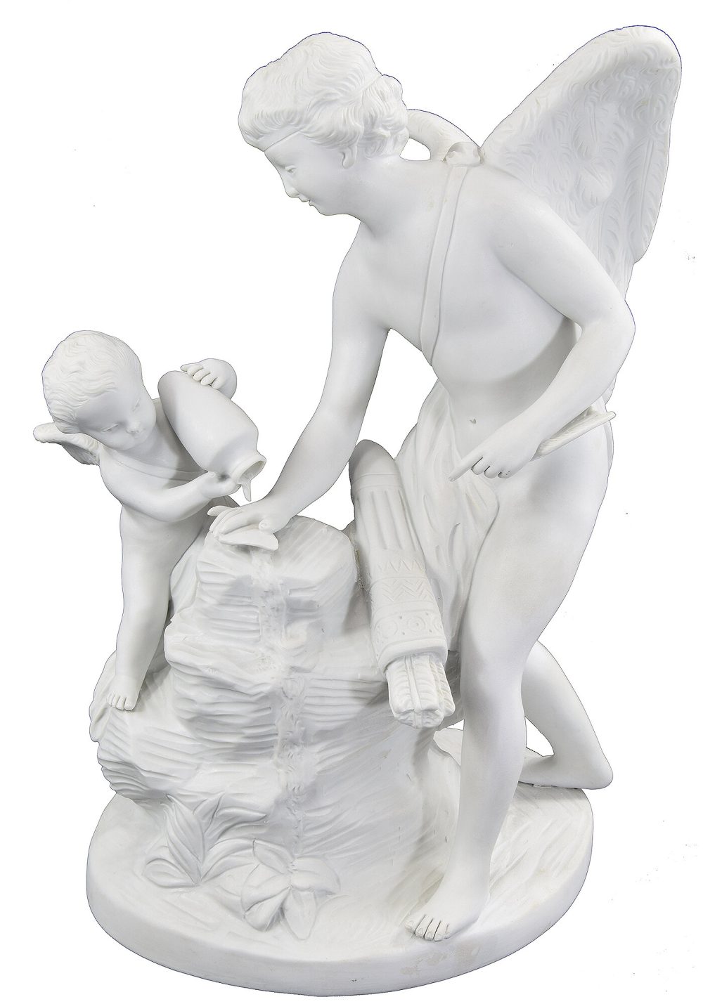 Sculpture en biscuit à figure d’un angelot forgerons et de cupidon s’affairant à la réparation d’une flèche.