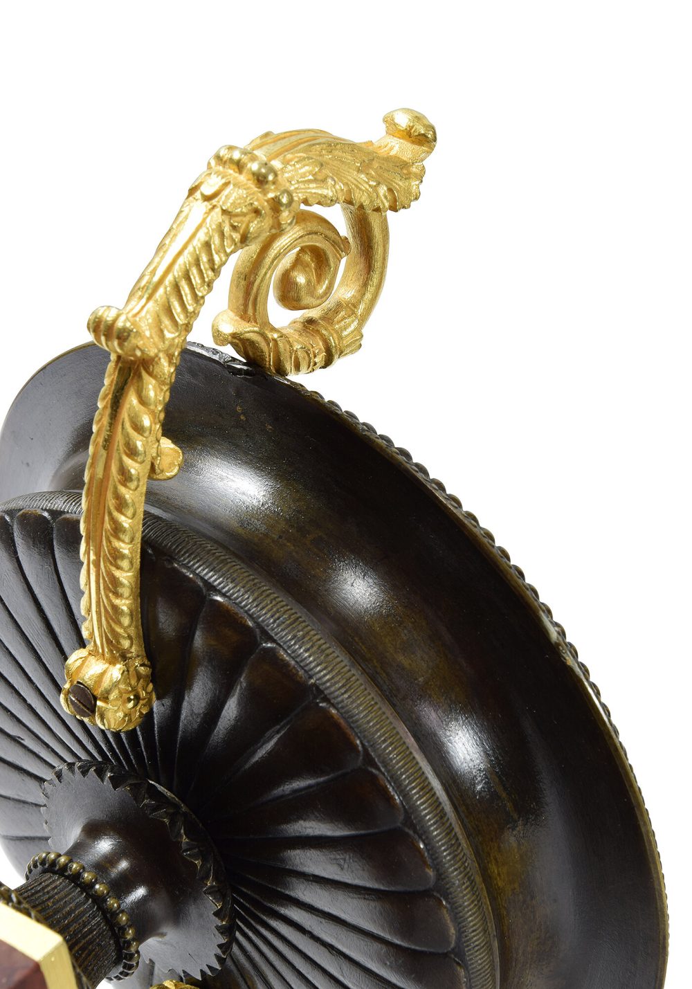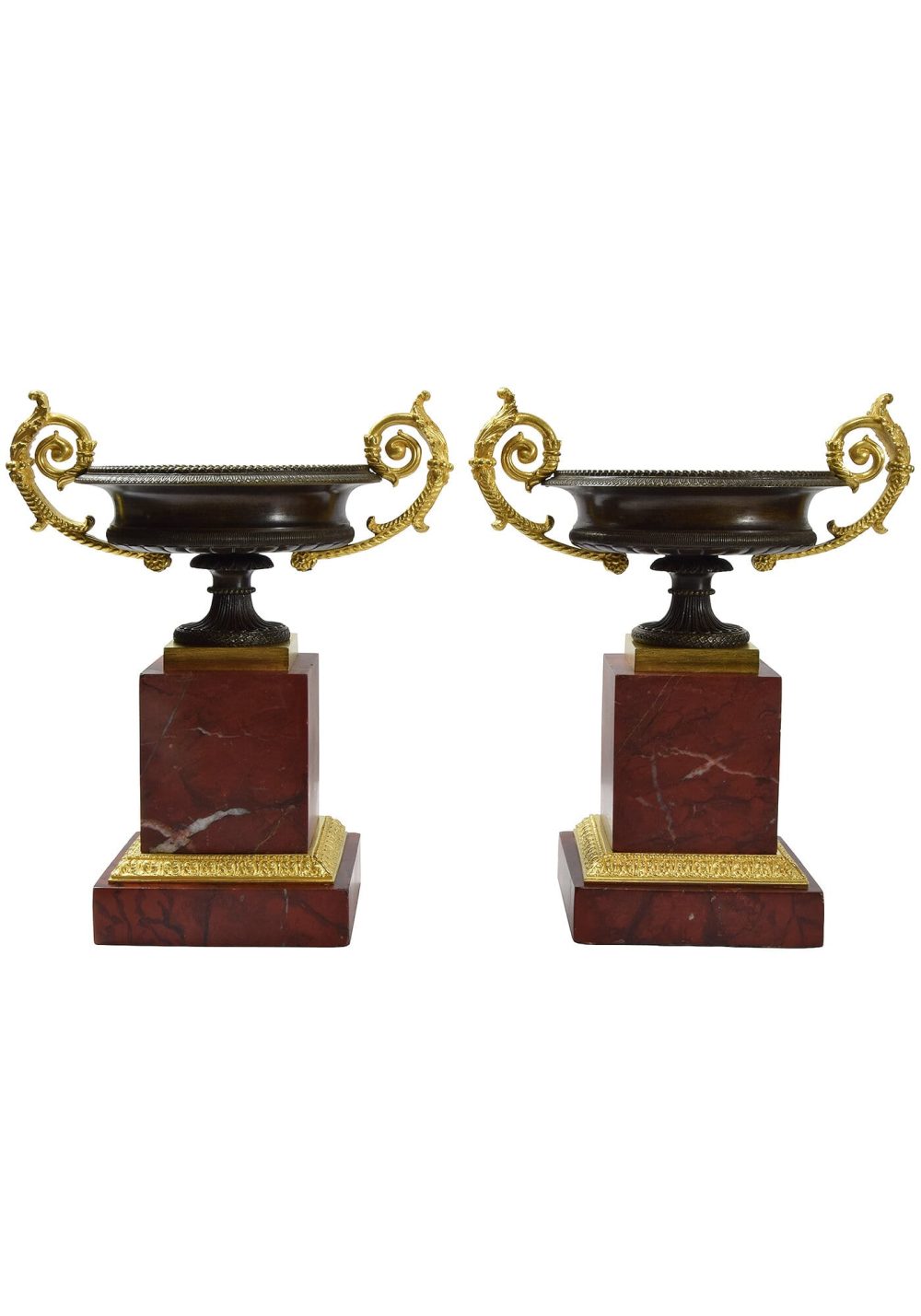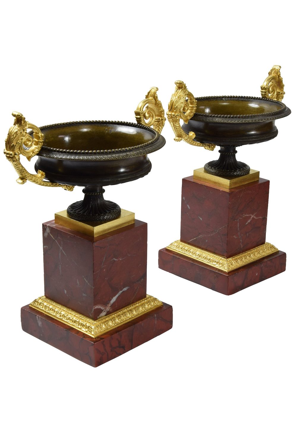 Très belle ensemble, paire de vasques a l’antique d’époque Restauration vers 1820. Haute qualité, constitué d’une vasque ciselée en bronze patiné équipé des anses finement ciselées en bronze doré au mercure. Base en marbre massive, rouge griotte.