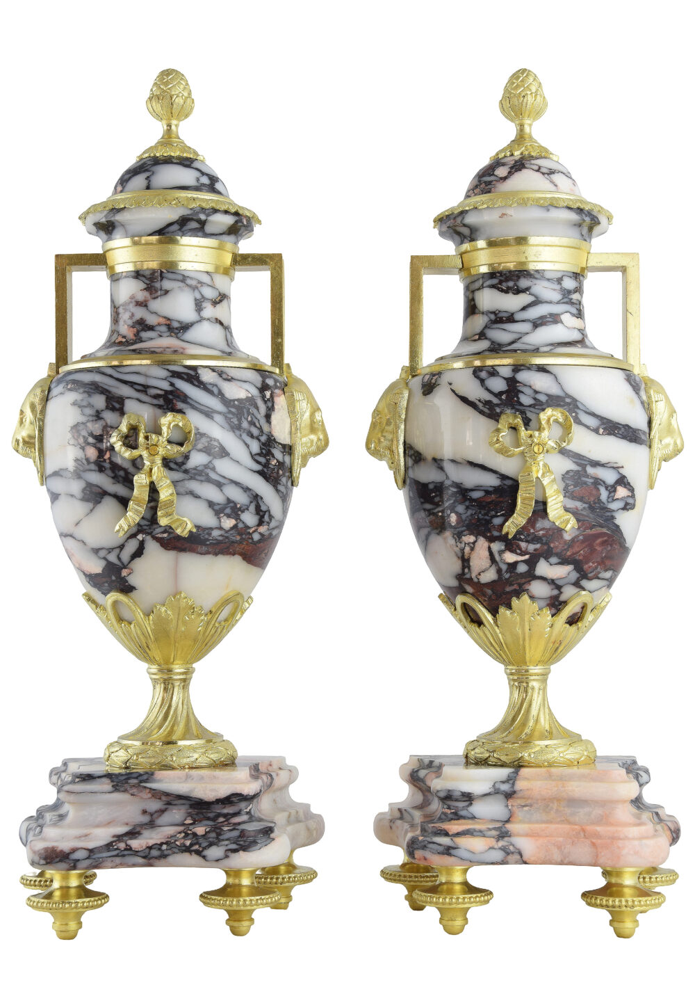 Élégante paire de vases d’ornement en marbre et bronze doré à l’or. D’époque fin XIXème dans le style Empire. Cette somptueuse paire de vases décoratifs séduit par une architecture raffinée et une silhouette épurée. Réalisés dans un marbre veiné aux contrastes puissants. Chaque vase adopte une forme ovoïde généreuse, reposant sur un piédouche élancé et une base à gradins, conférant à l’ensemble un équilibre harmonieux. Le col, légèrement resserré, est surmonté d’un couvercle bombé terminé par une prise en forme de pomme de pin.